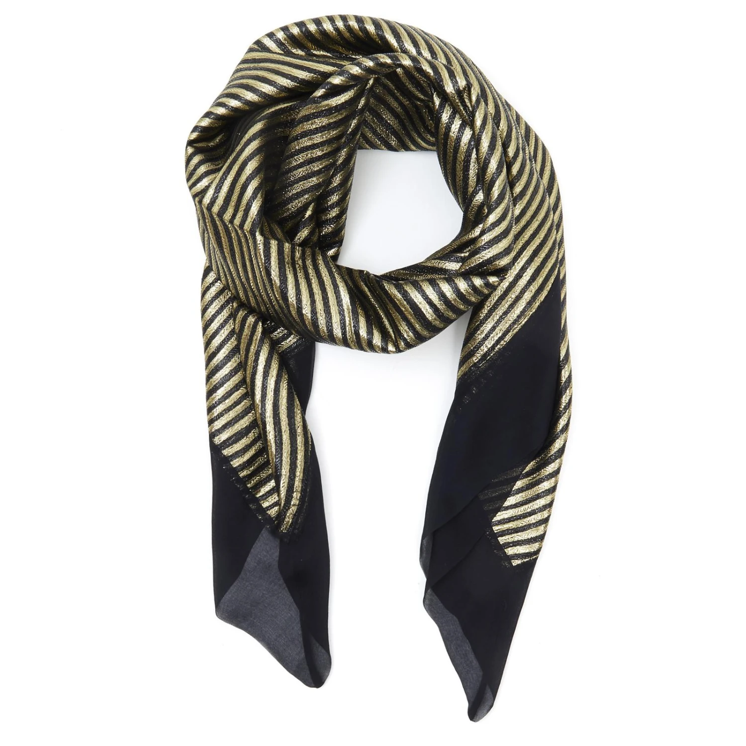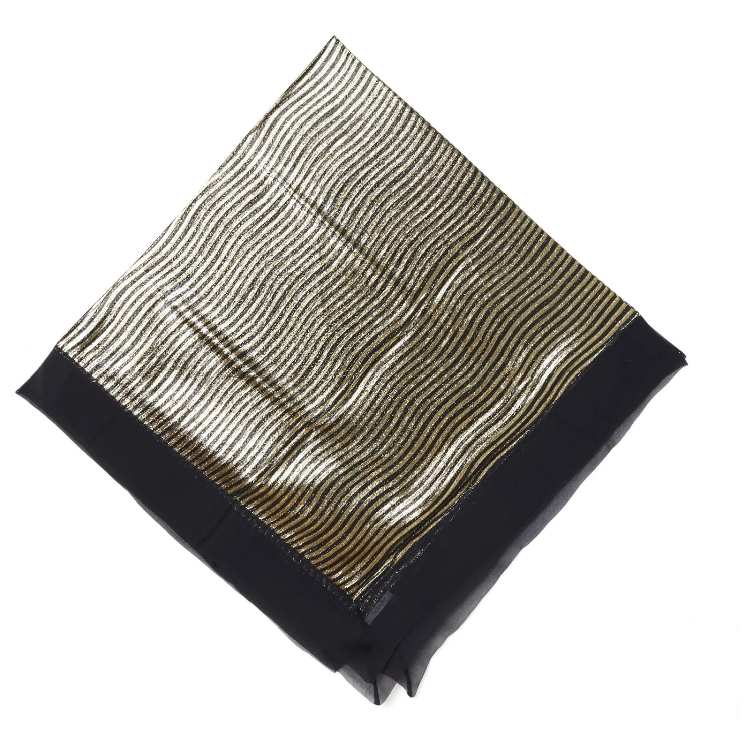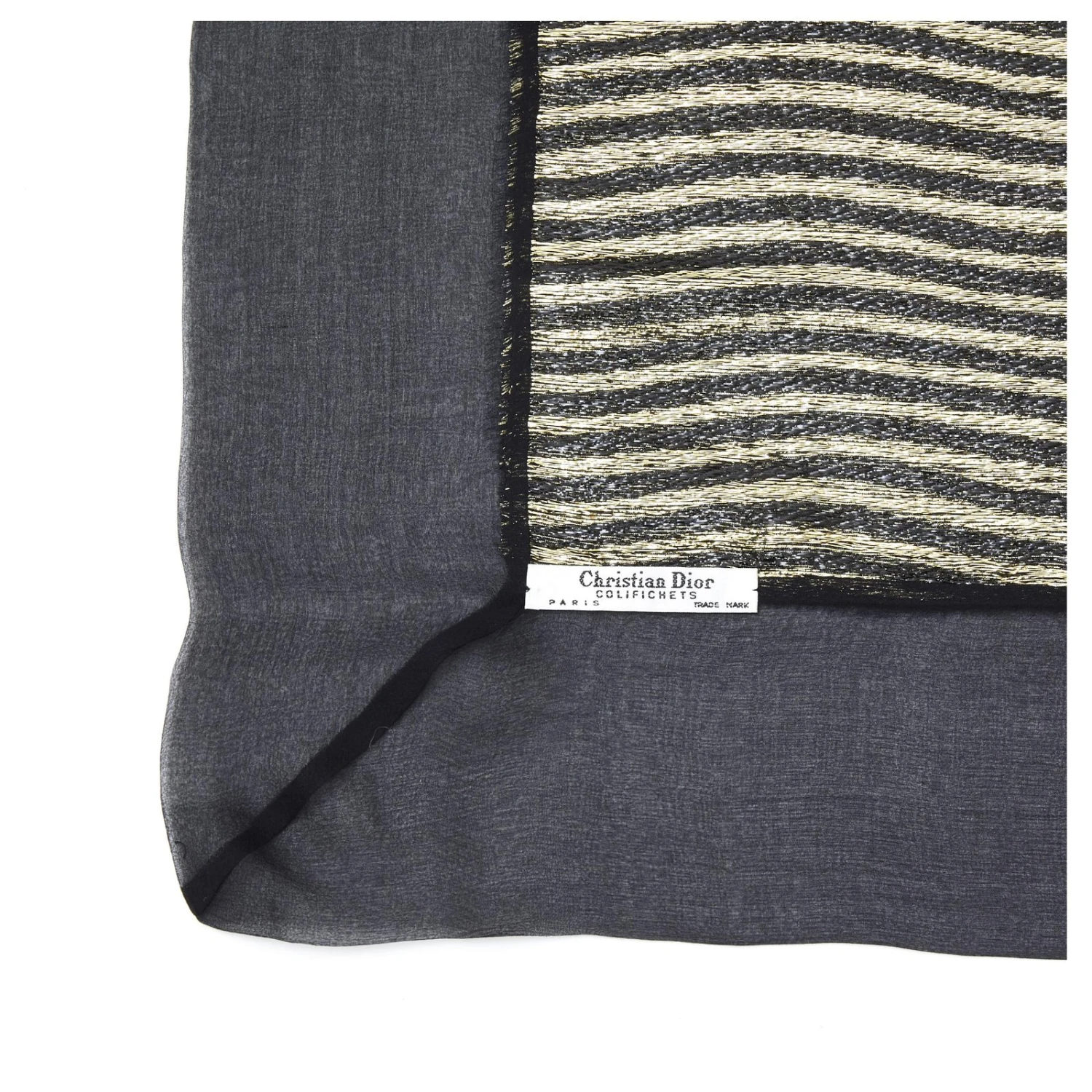 Très grand foulard Christian Dior carré en broché de soie et lurex à rayures noir et doré bordé de mousseline de soie noir. Largeur 132 cm x longueur 132 cm. Le foulard est probablement super vintage (signé Christian Dior Colifichets !), il est en parfait état et la souplesse et la richesse du tissu sont spectaculaires quand il est porté.