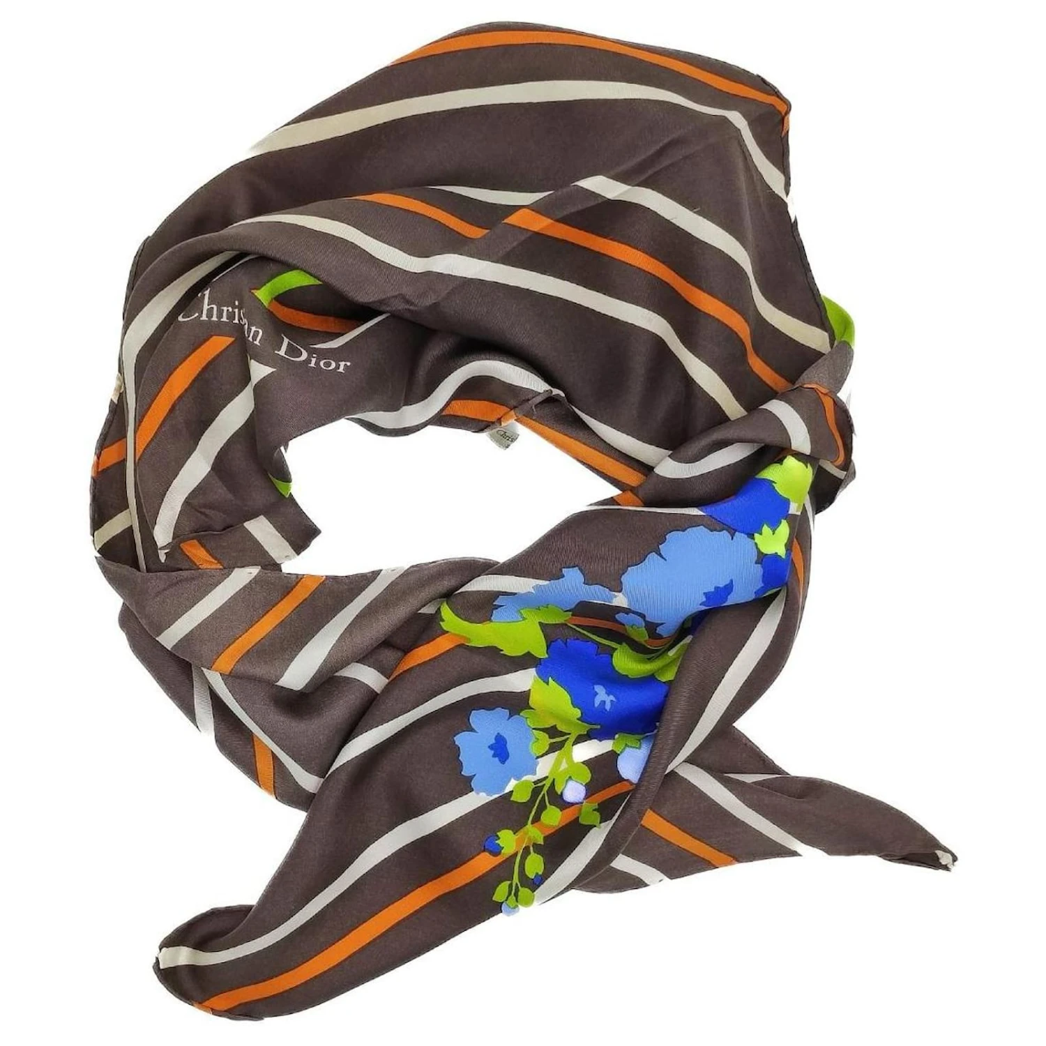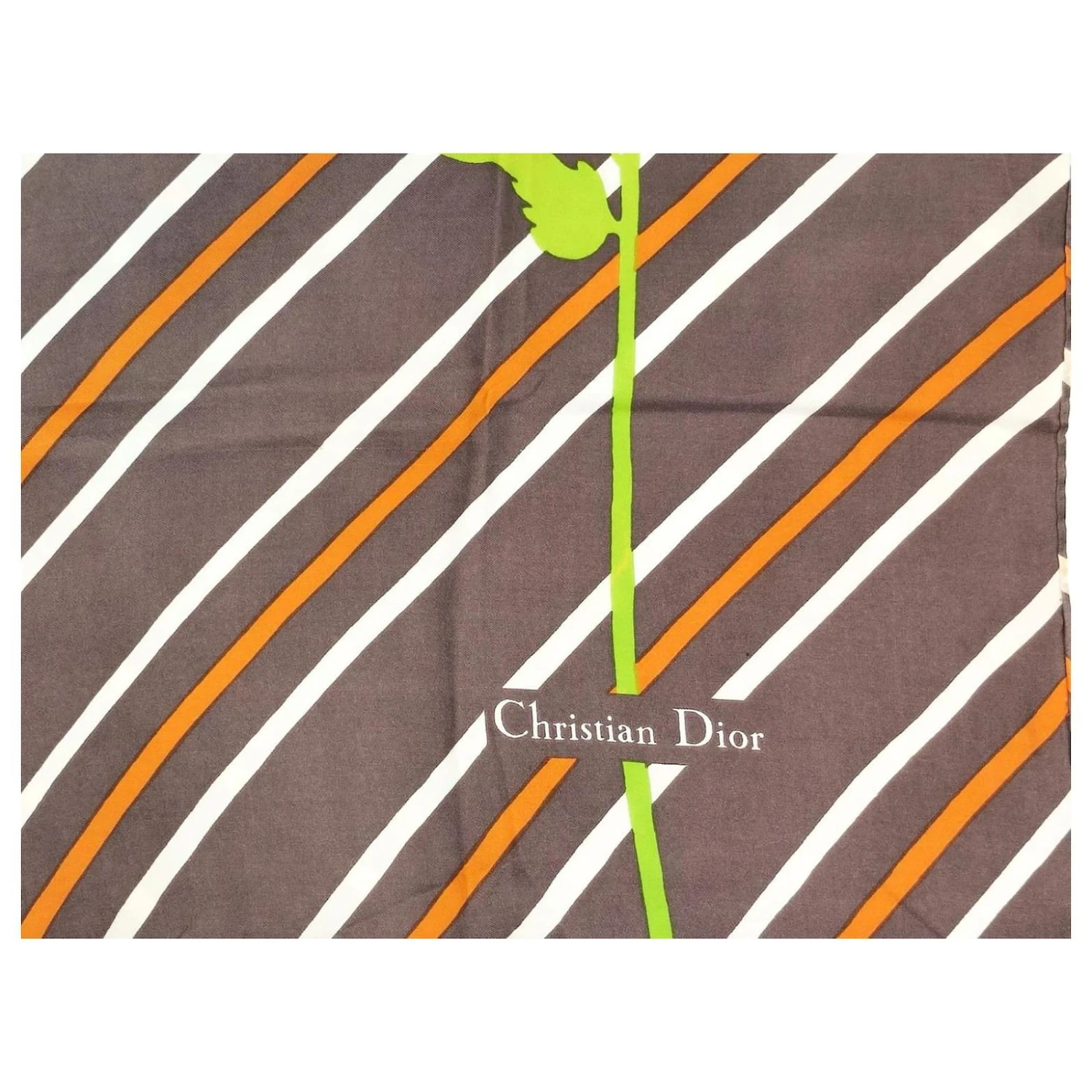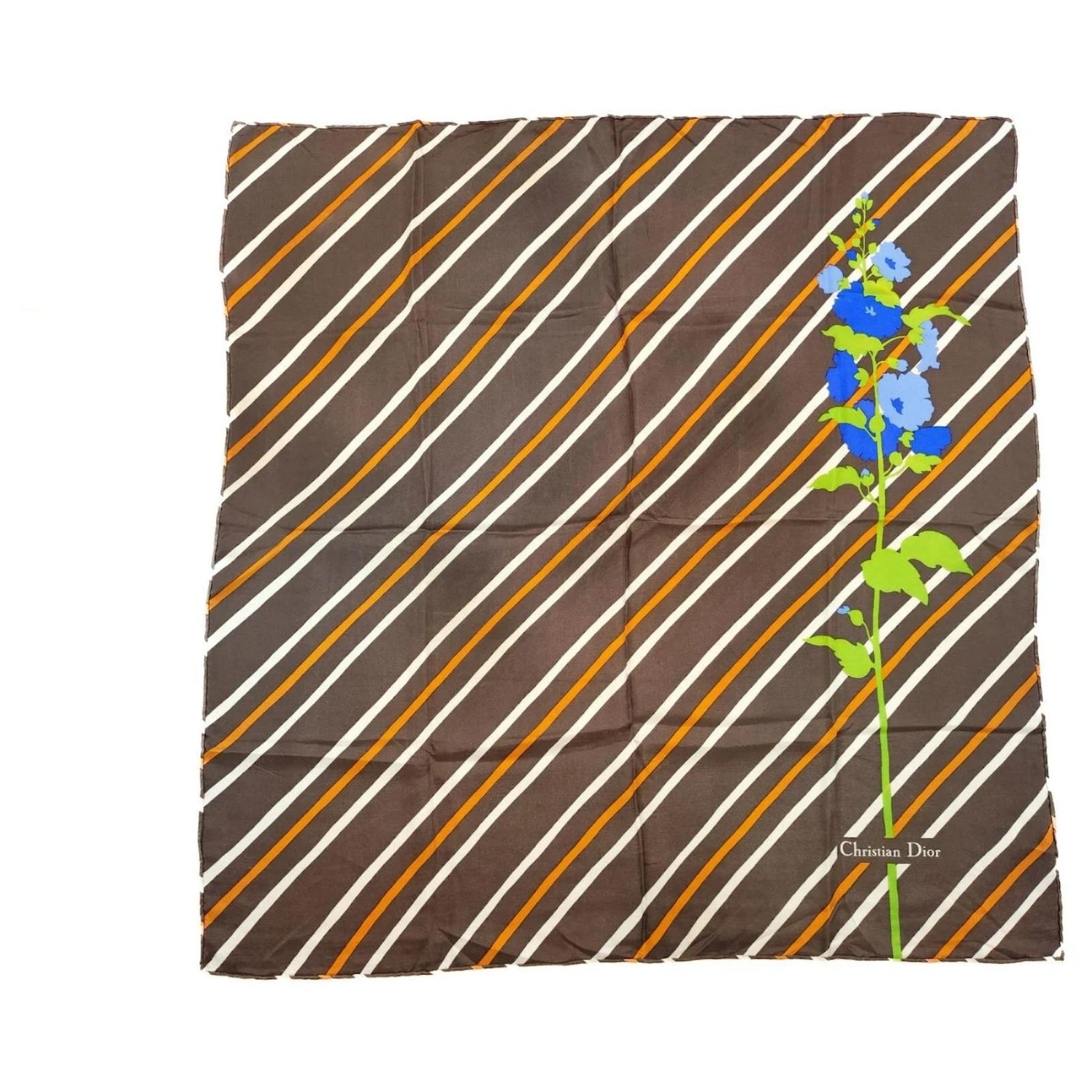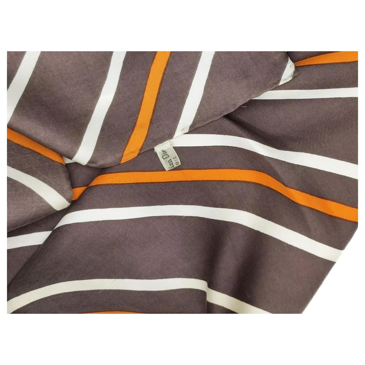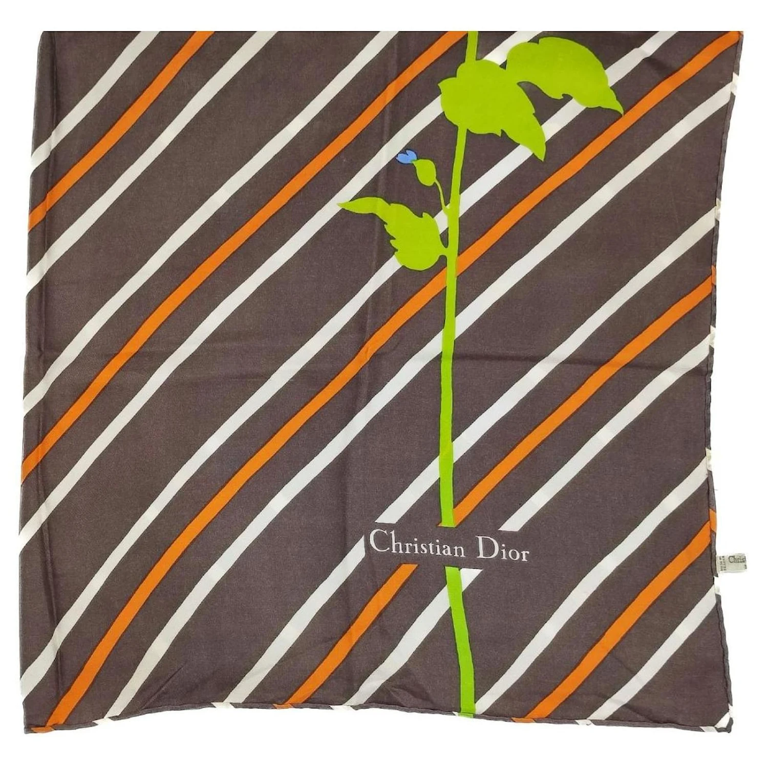 Foulard Carré Soie roulottée main de la maison Christian Dior motif à rayures diagonales oranges et blanches sur un fond brun avec une belle fleur bleue sublimé par la signature CHRISTIAN DIOR.