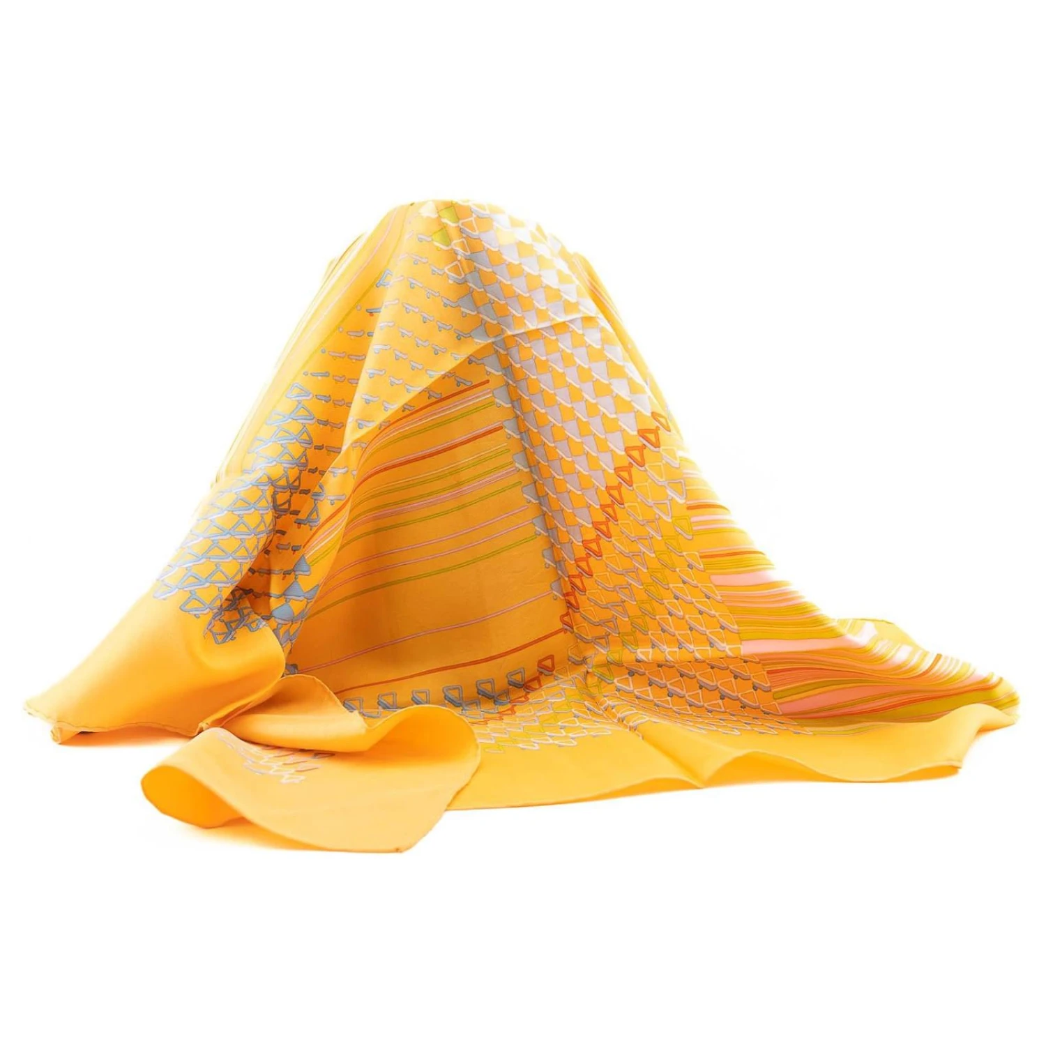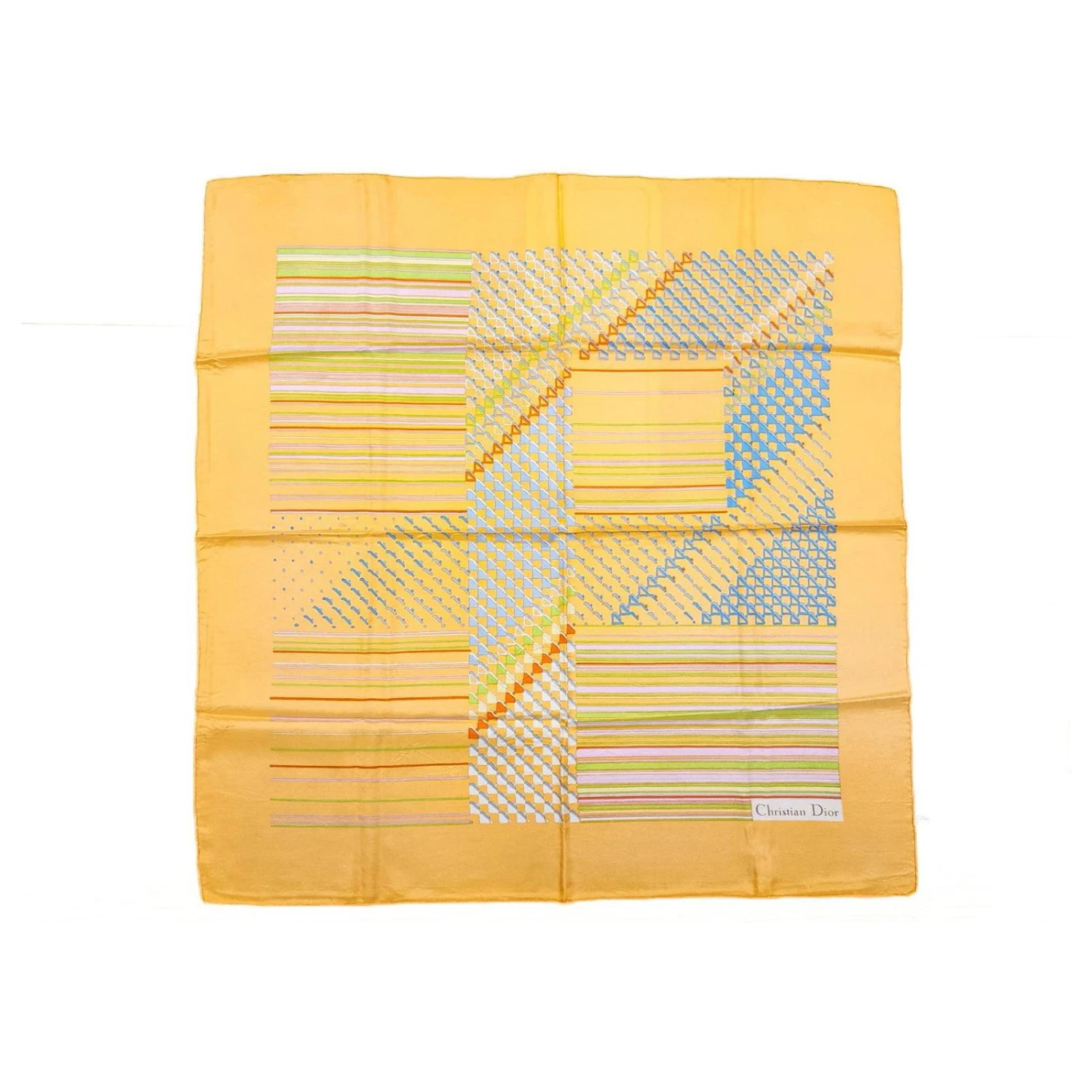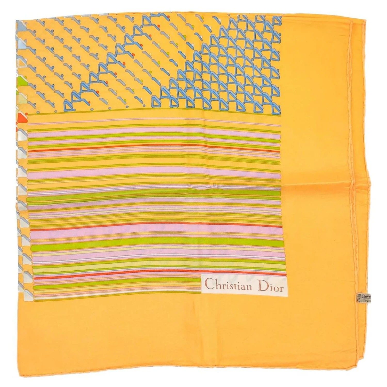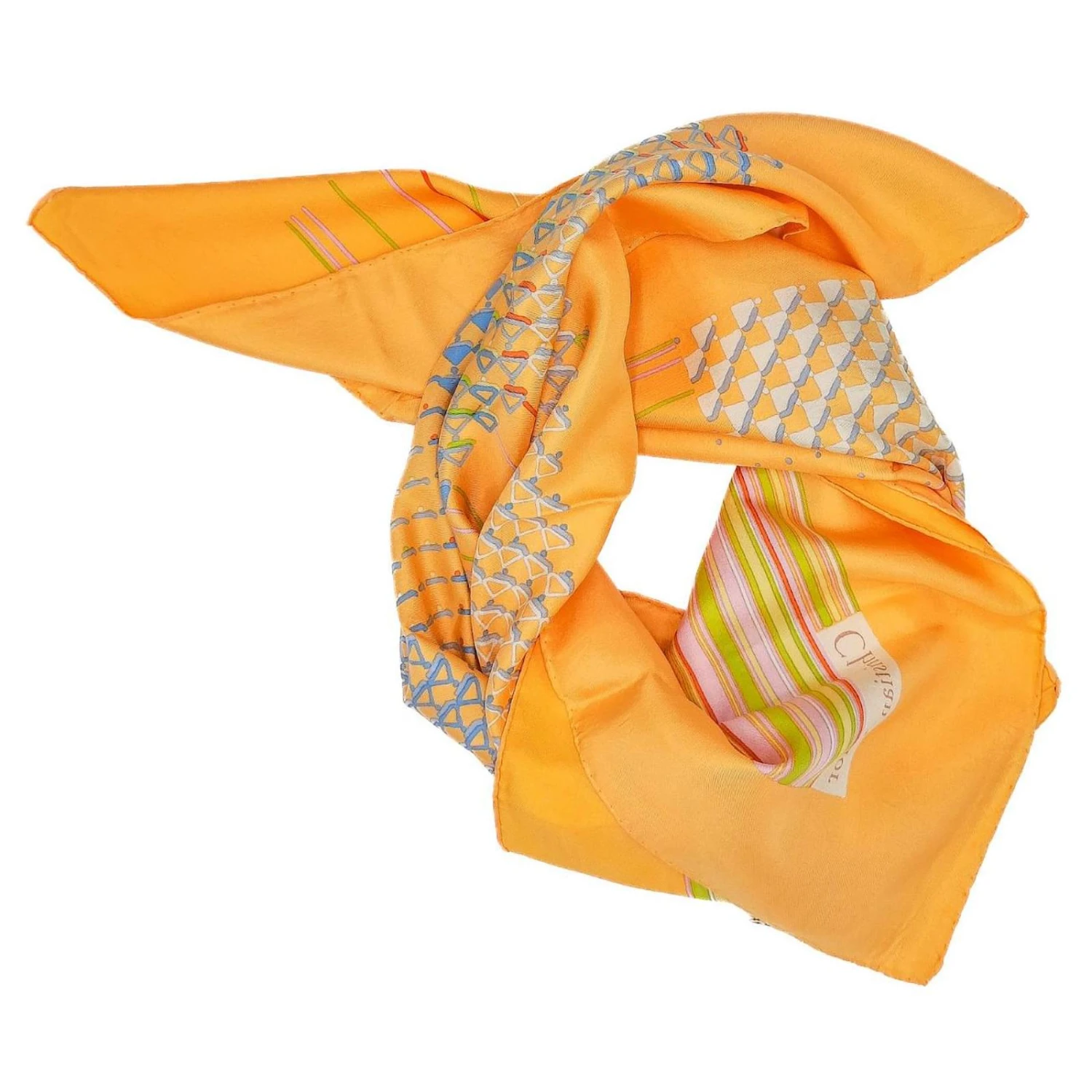 Foulard en soie roulotté à la main de la maison Christian Dior motifs géométriques colorés sur un fond orange claire.