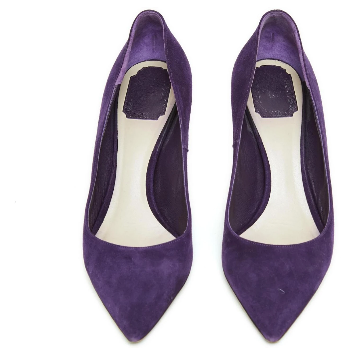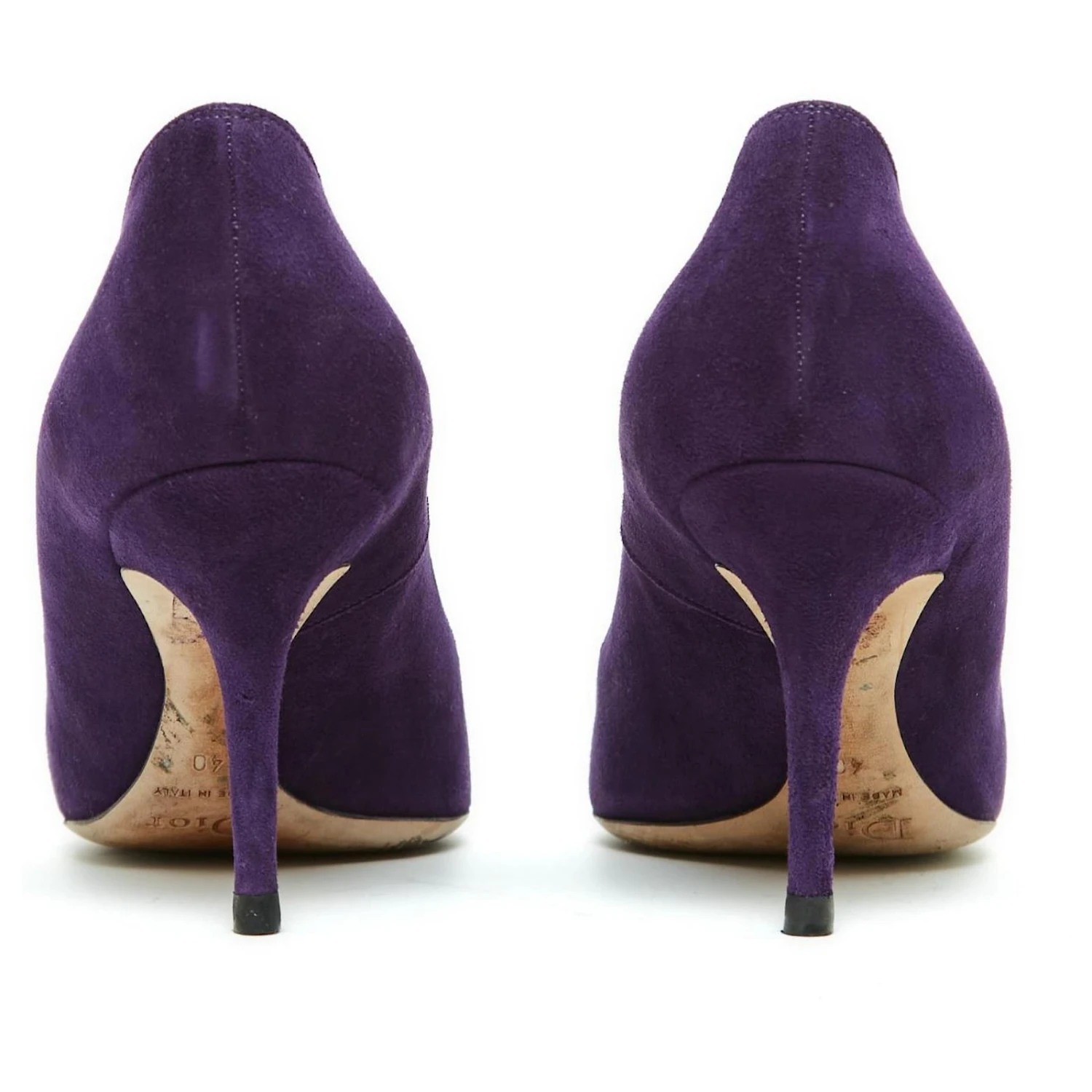 Escarpins Christian Dior en daim violet foncé, talon aiguille moyen, bout pointu, intérieur cuir. Pointure FR40, talon 7.5 cm, semelle intérieure 25.7 cm (hors pointe). Les escarpins ont été portés mais ils sont en très bon état, magnifique classique.