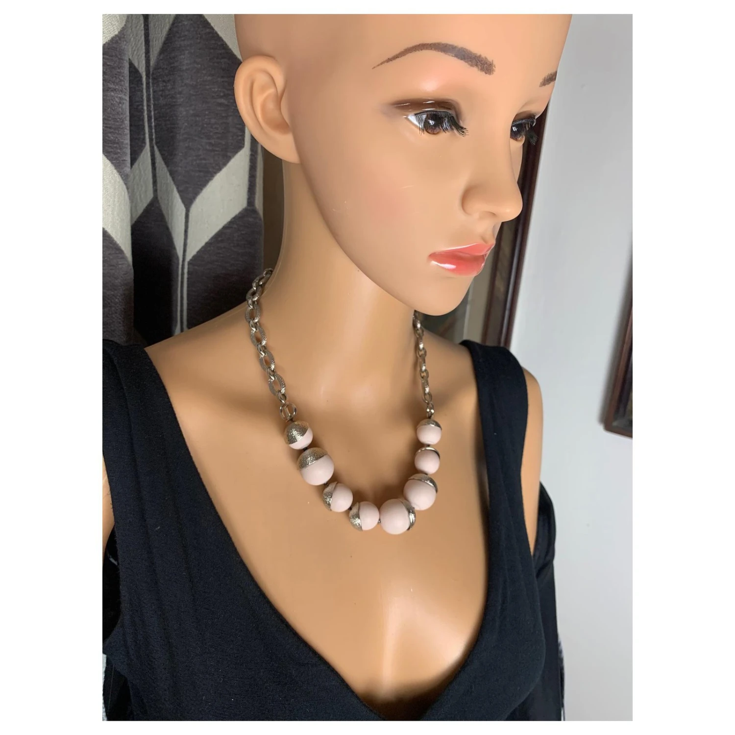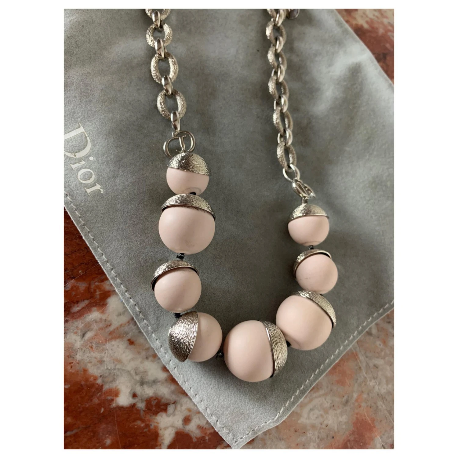 Collier en métal argenté et perles en matériaux de synthèse couleur rose pale.