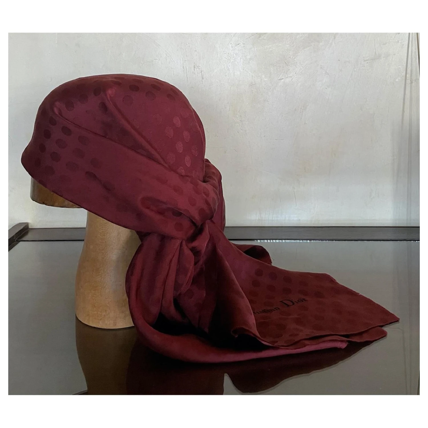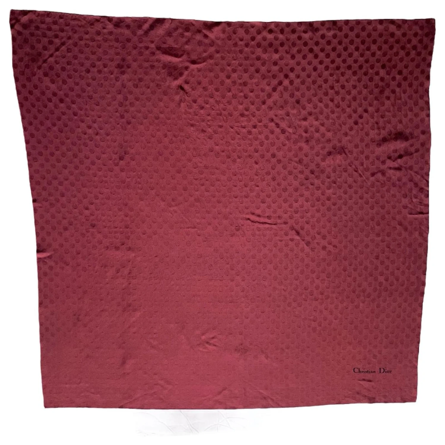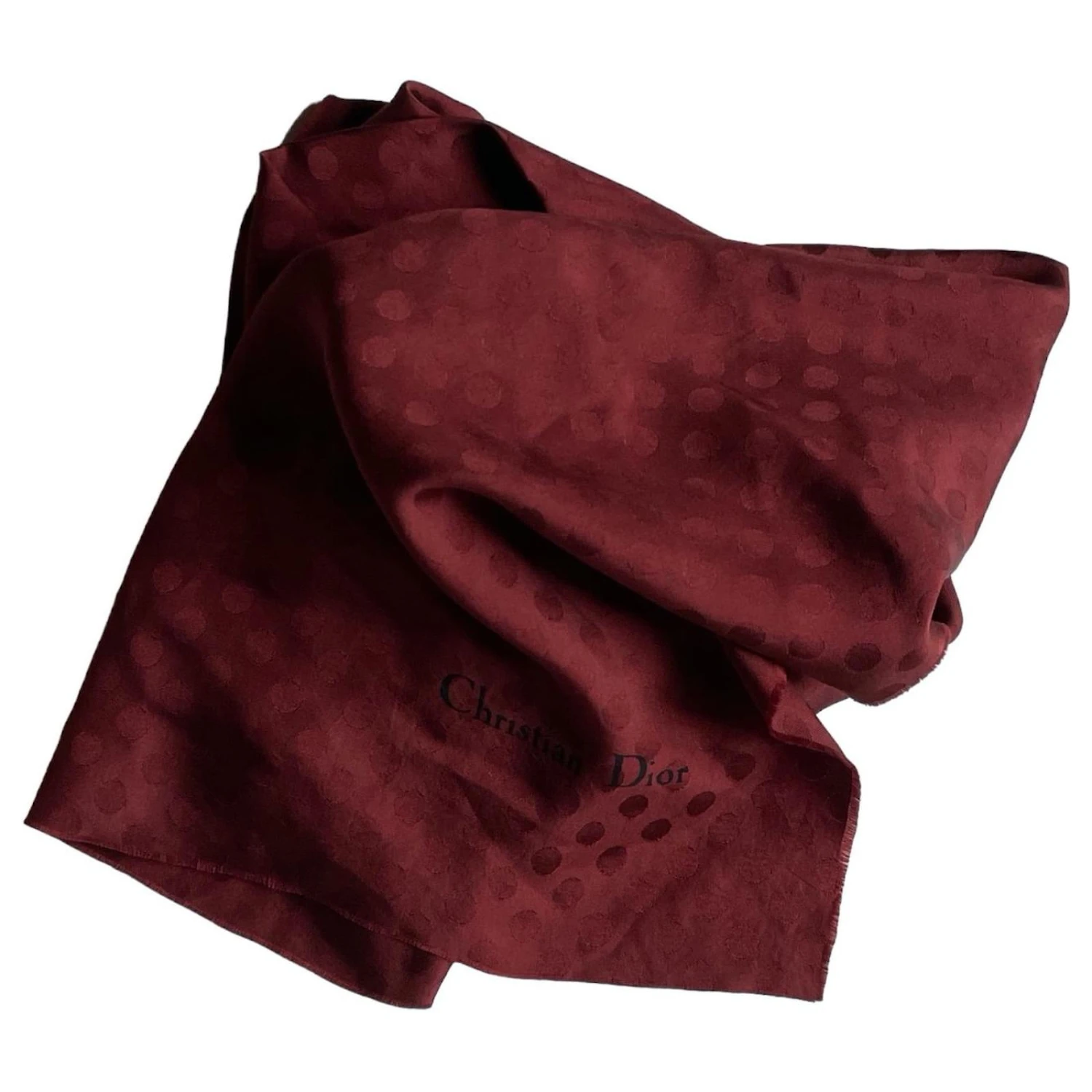 Christian Dior Foulard Bordeaux Vintage. Motif ton sur ton pois. Extrémités effilochées. Étiquette de composition délicatement retirée, se sent comme de la soie. MESURES: 89 cm x 89 cm. En bon état, pas de défauts, juste des signes d’usure réguliers.