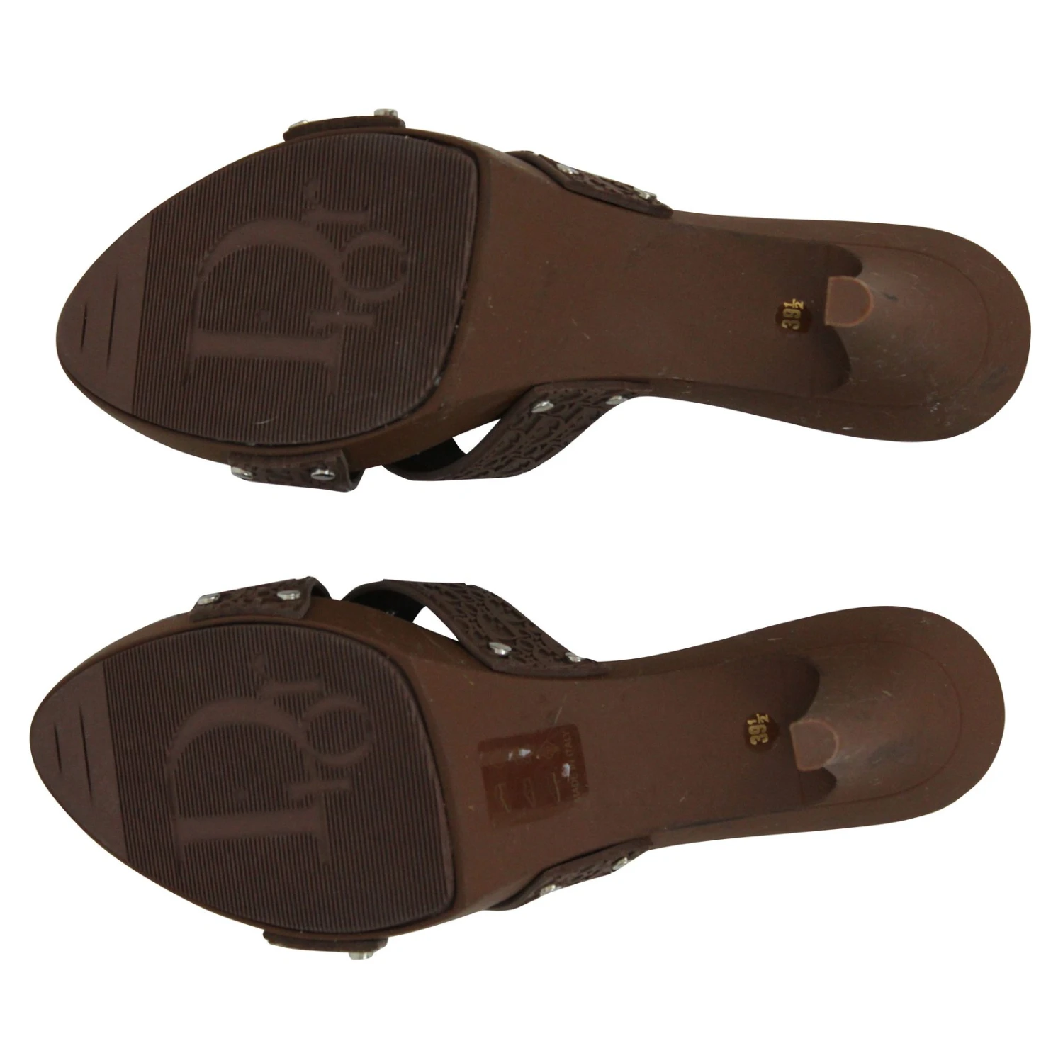 Mules en Caoutchouc en couleur chocolat clair. Talons 8 cm avec plateforme de 1,5 cm. Taille 39,5 mais taille très petit (équivalent à un 38).