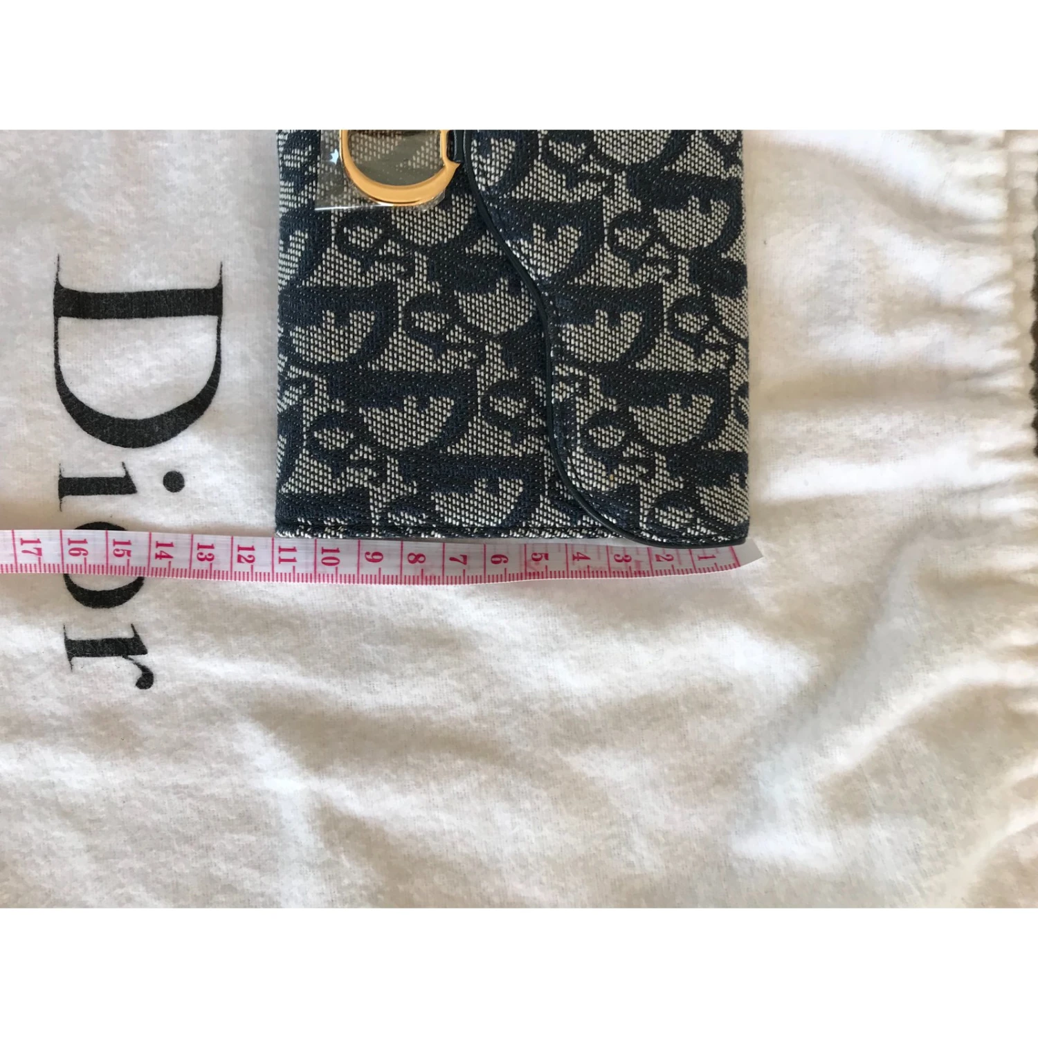 Portefeuille /porte-monnaie Saddle en toile monogramme bleu, accastillage doré. L’intérieur est en cuir bleu marine. 1 Compartiment porte-monnaie, compartiment cartes (5), compartiment billets,