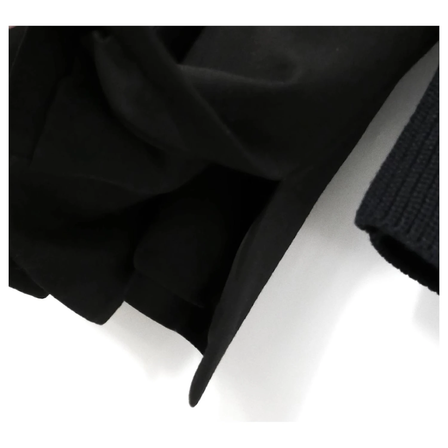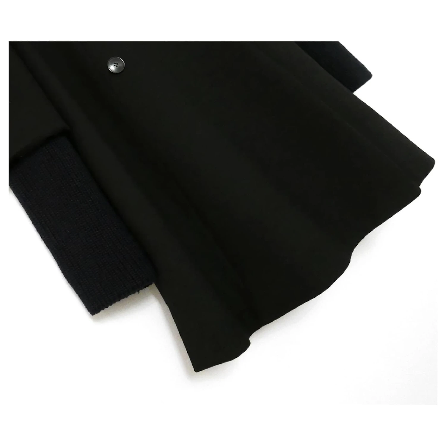 Fabriqué à partir d’épaisseur, laine noire lisse avec poignets en tricot bleu marine contrastés. Superbement ajusté avec des épaules renforcées,
