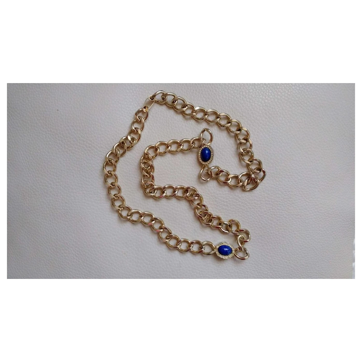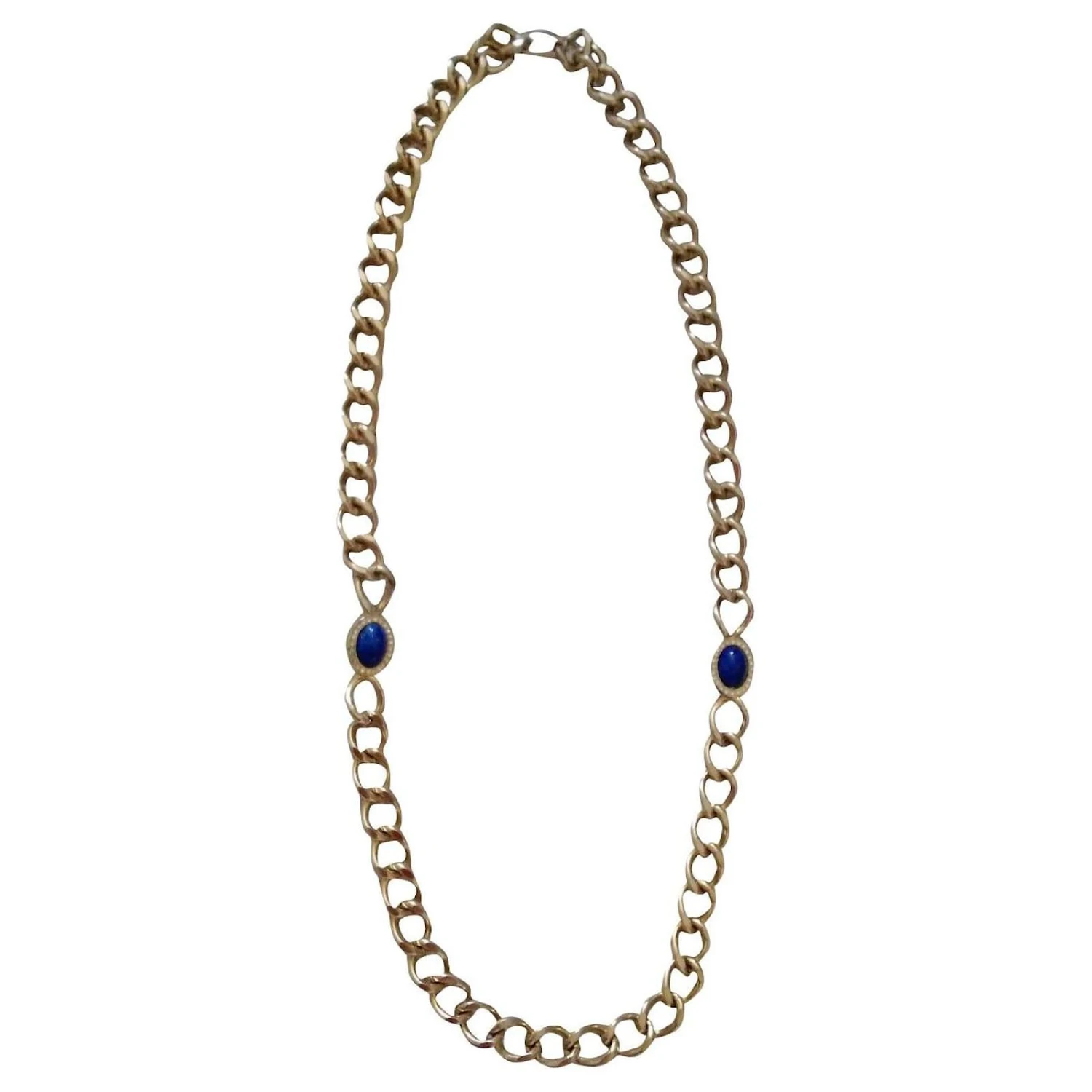 Long sautoir chaîne lourde en plaqué or cabochons lapis lazuli recto verso sertis de cristaux.