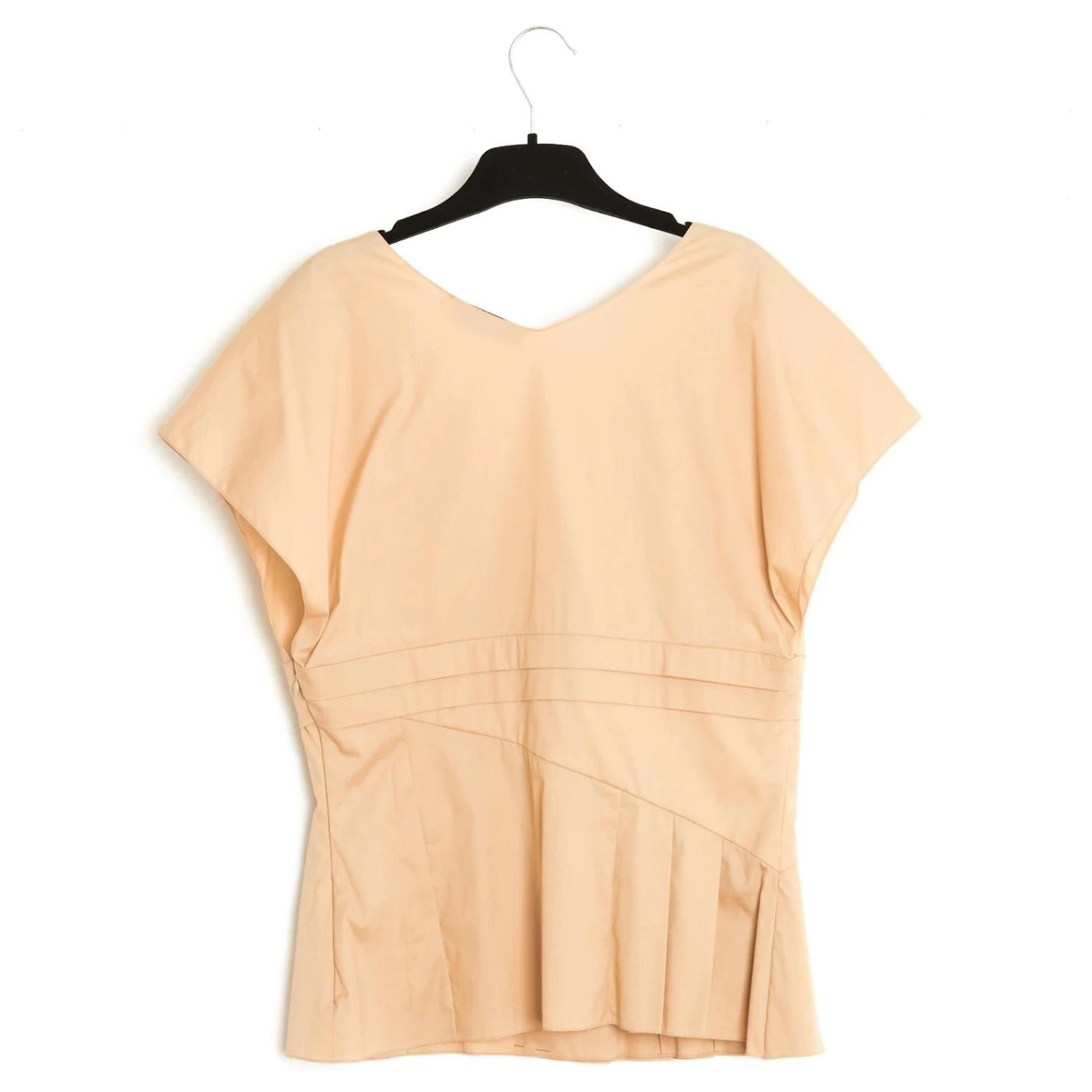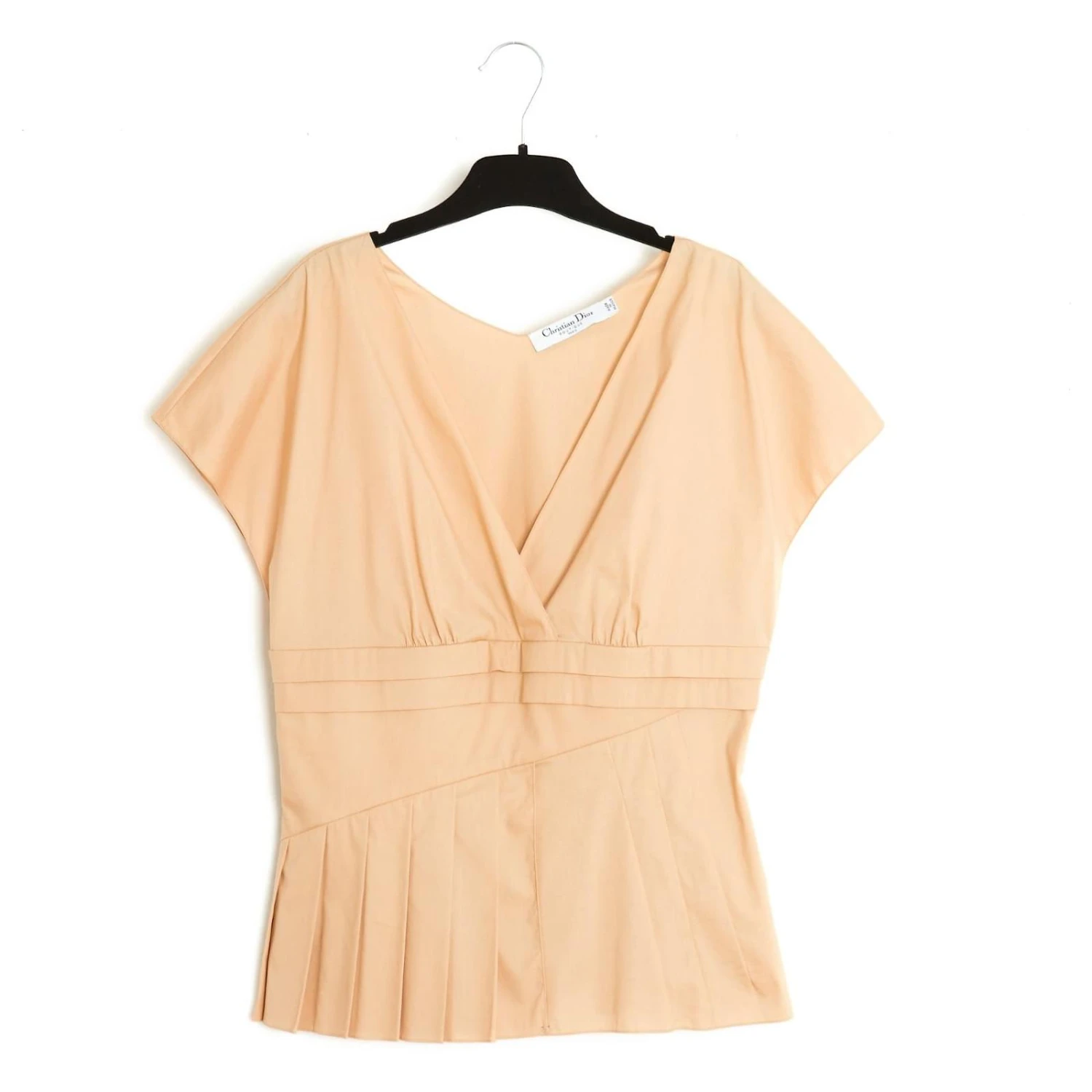 Top Christian Dior blouse collection PE 2007 par John Galliano en gabardine légère de coton mélangé beige, profond décolleté V devant, partiellement plissé sous la taille, non doublé, fermeture par un zip sur le côté. Taille 42FR (convient au 40FR) : carrure 40 cm, poitrine 42 cm, taille (haute) 40 cm, longueur 63 cm. Le top est en très bon état, parfait pour les beaux jours, avec un beau collier sur une jolie peau doré.