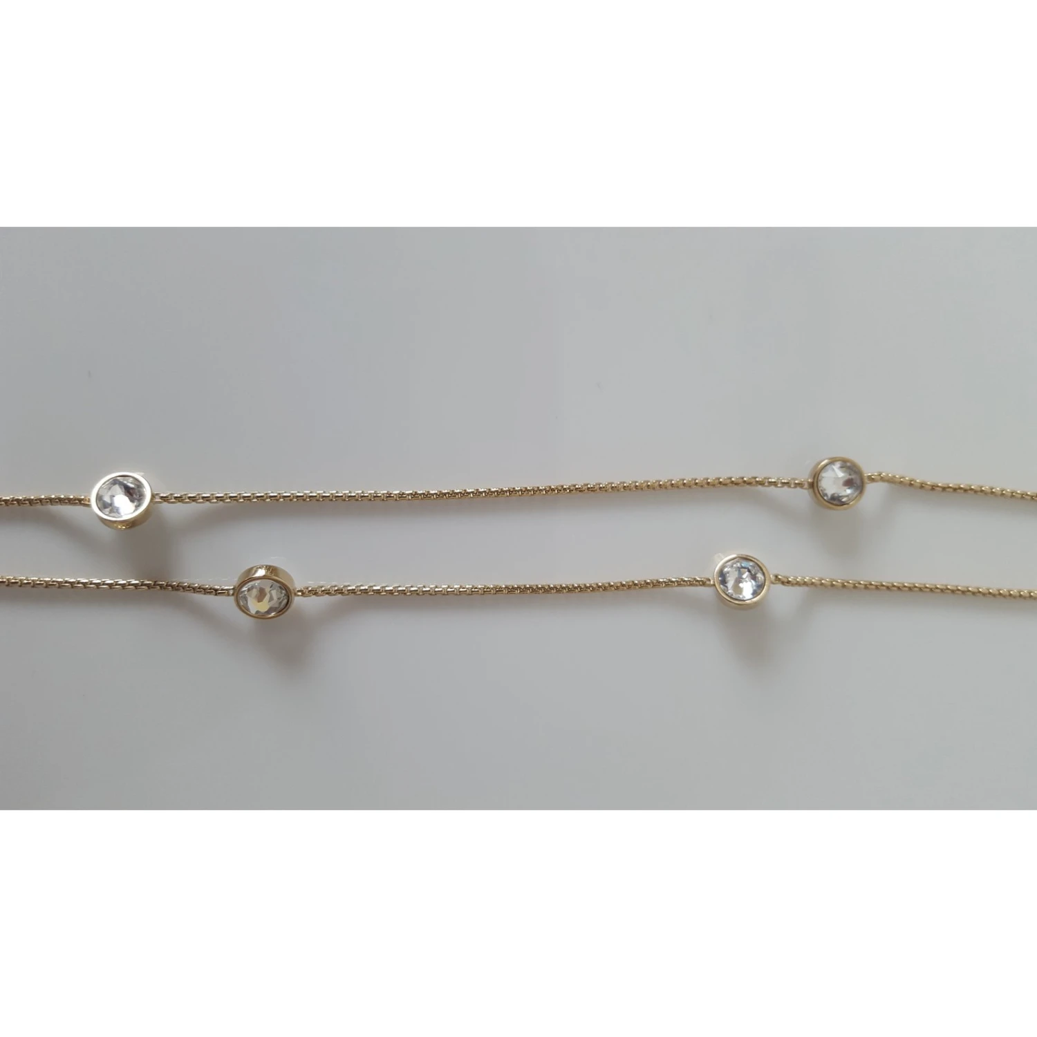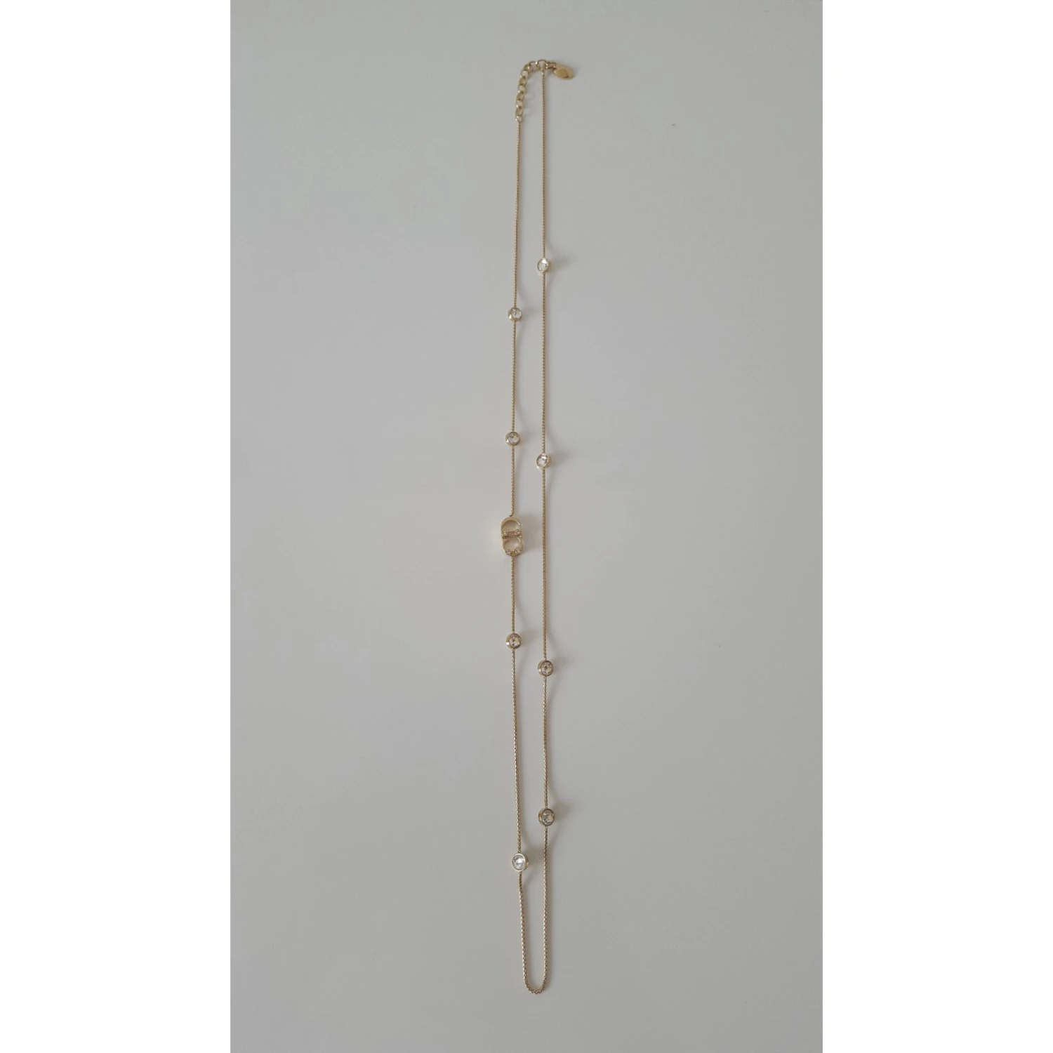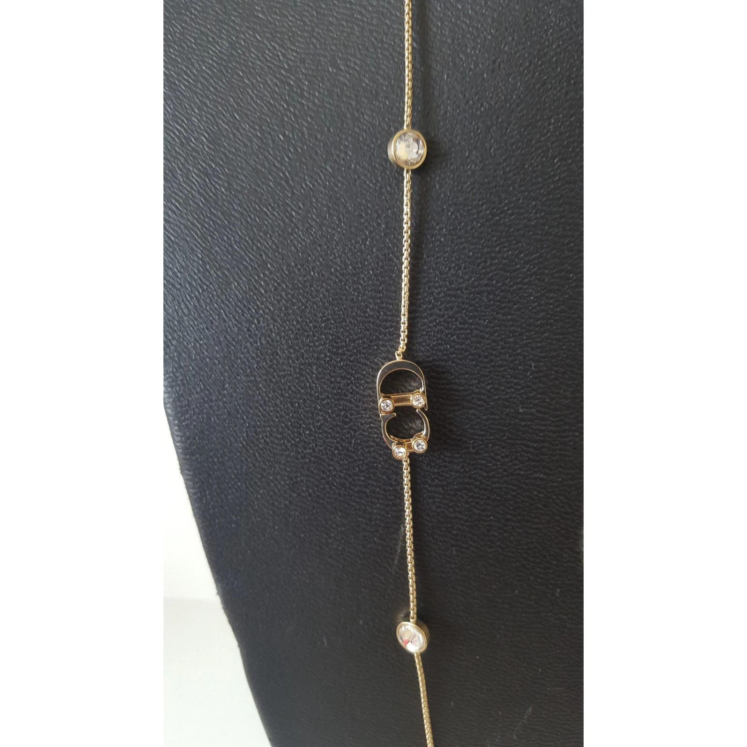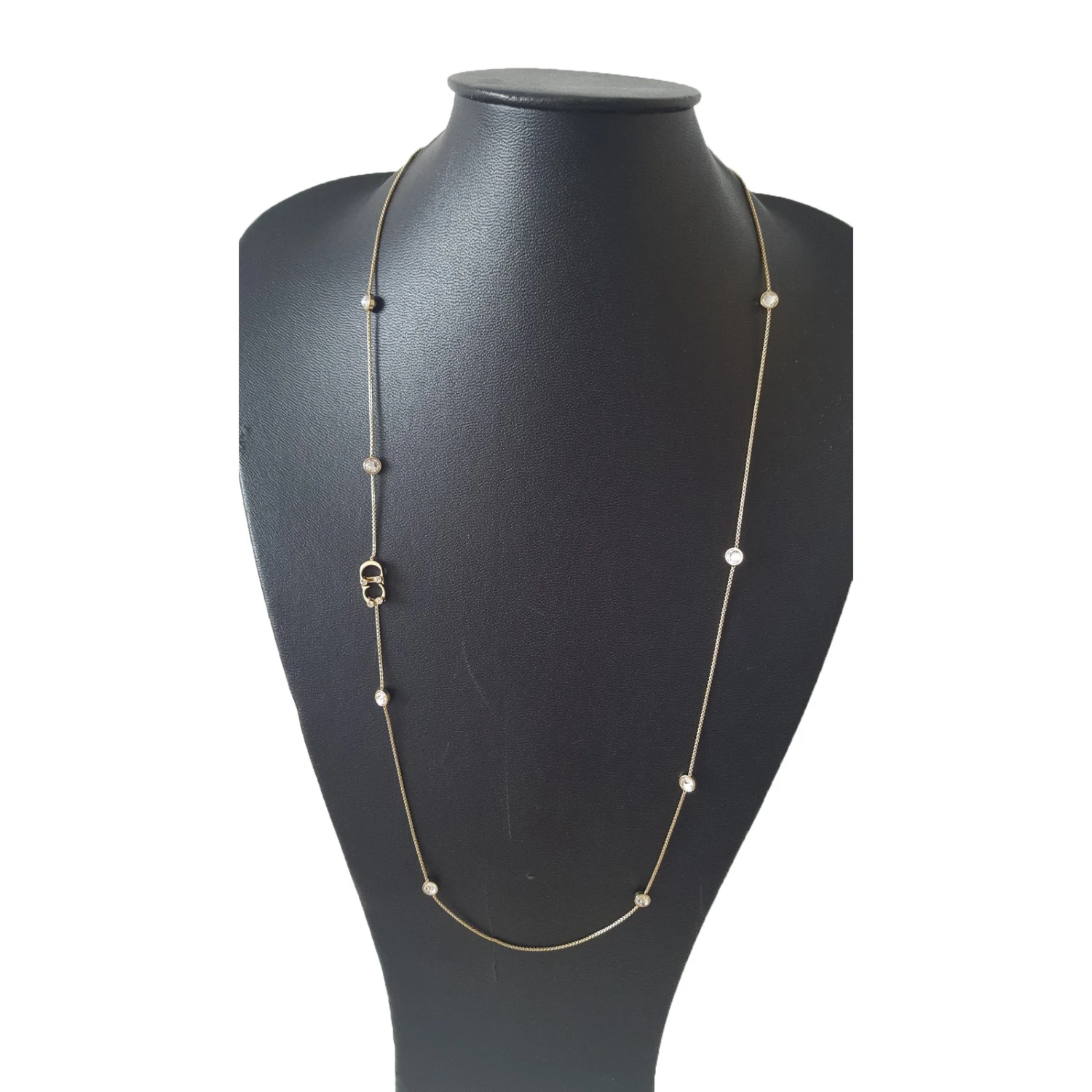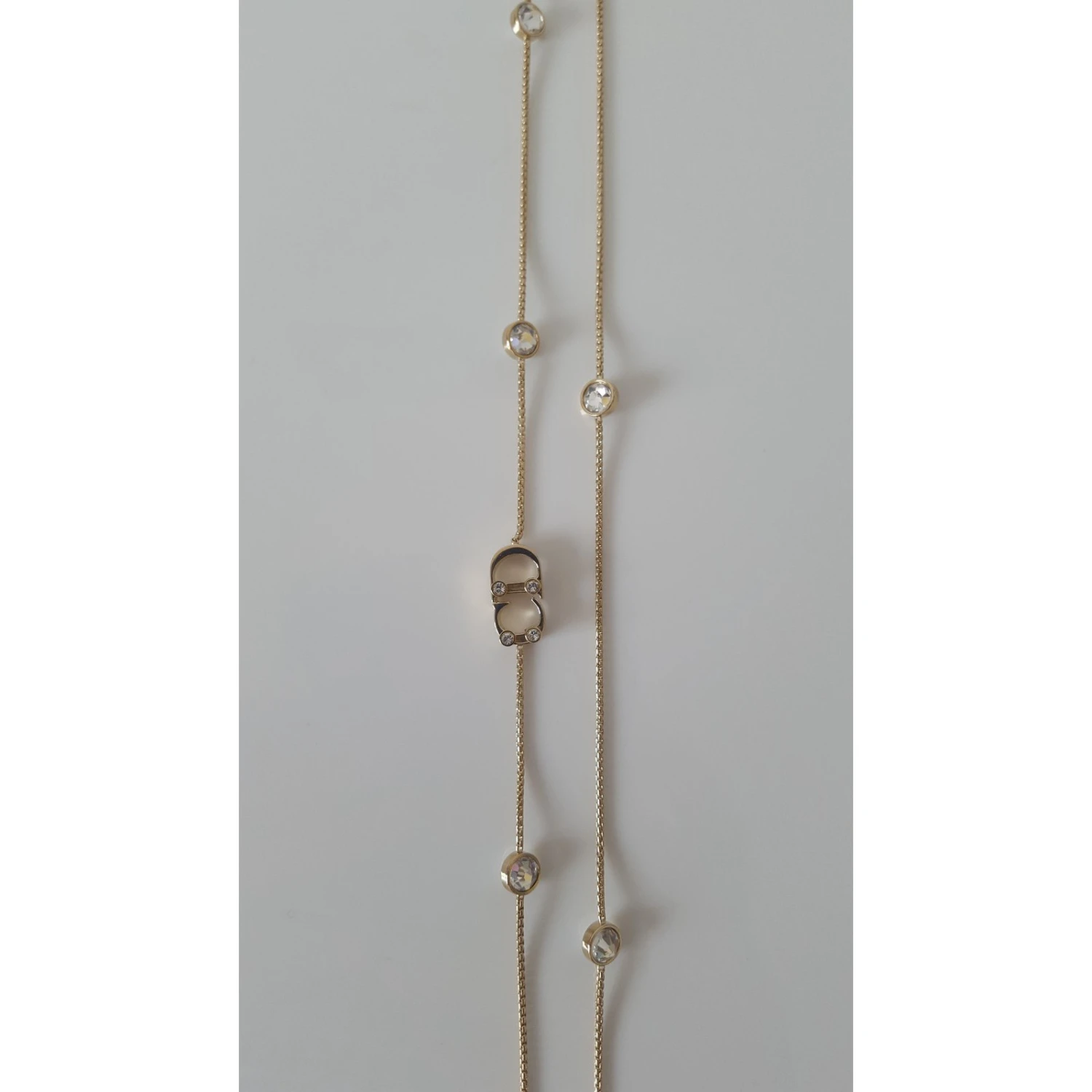 Très beau collier Dior, en métal doré et cristaux transparents clairs, neuf, jamais porté et en excellent état.. Il est agrémenté de huit strass et du logo « CD » en métal doré. Le logo est serti de quatre strass clairs. Fermoir avec système » mousqueton » et plaque gravée « CD » devant et » Dior » au dos. Porte toujours son étiquette d’origine. Dimension: longueur totale 79cm. Vendu avec pochon, papier de soie, boite cadeau, ruban et sac shopping.
