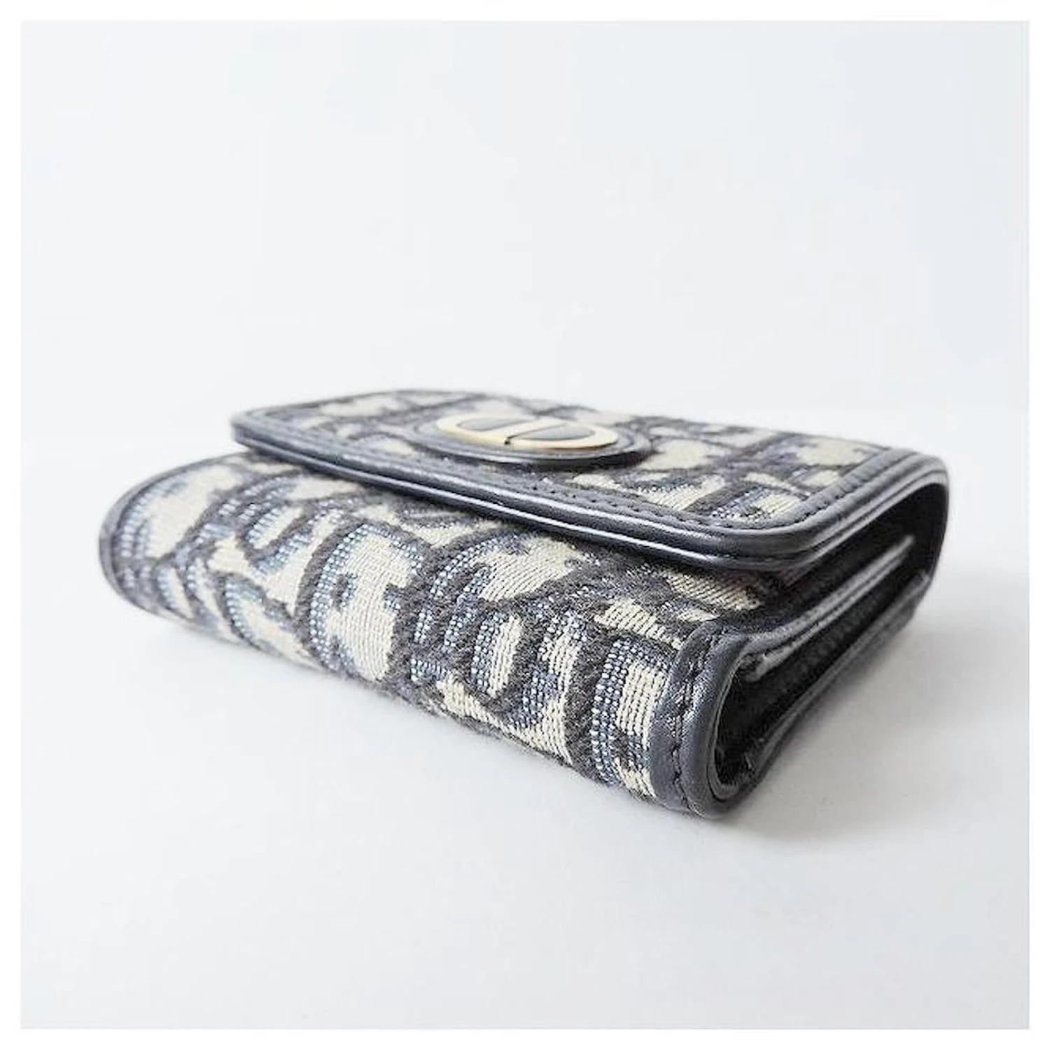 Présentation du portefeuille à trois volets Christian Dior Logo-gram, un portefeuille élégant dans la catégorie des portefeuilles à trois volets. Ce portefeuille à trois volets, conçu par Christian Dior, présente un design élégant dans des couleurs bleu marine et ivoire. Il est fabriqué à partir d’une combinaison de jacquard et de cuir, lui donnant une construction sophistiquée et durable.
