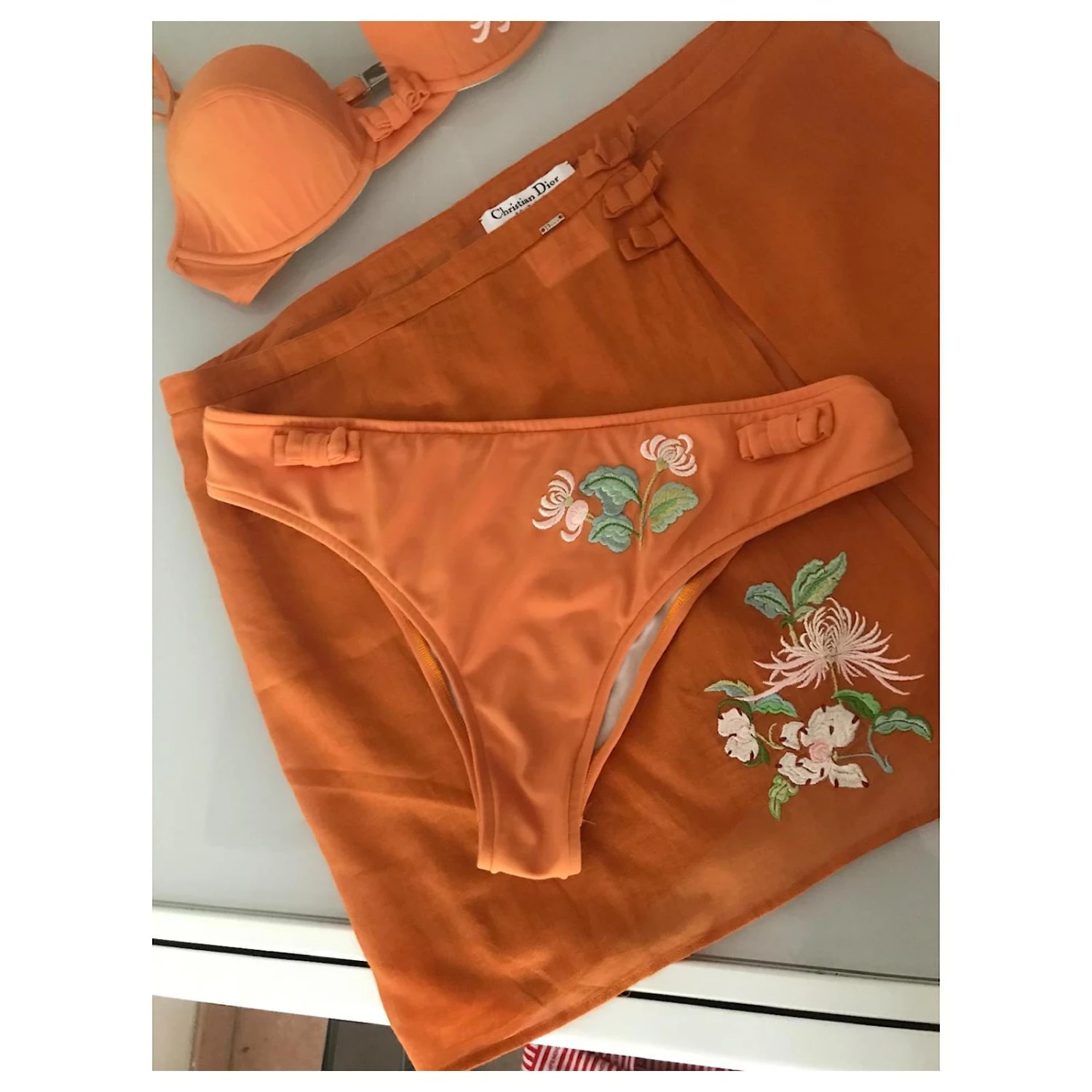 Maillot de bain dior 2 pièces. Vendue avec son paréo. Convient à un 38 et un 95B. En parfait état. Il manque un bouton au paréo mais ce n’est pas gênant.