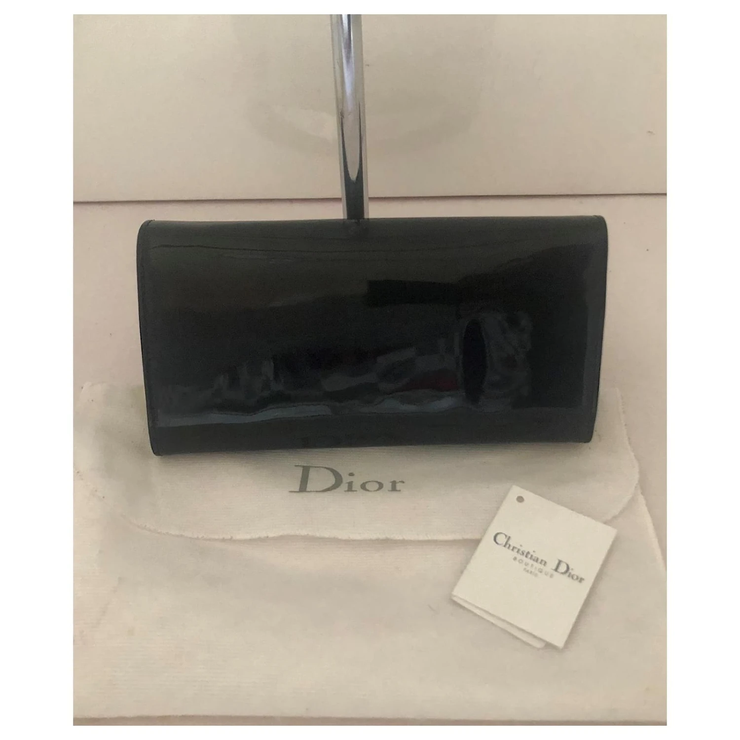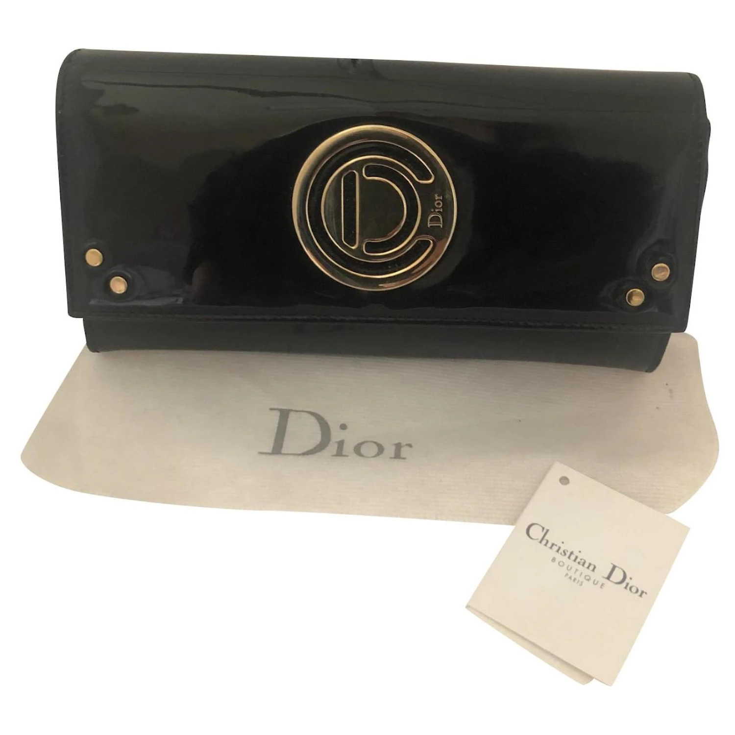 Portefeuille en cuir verni noir avec du matériel d’or . Numéro de série. Porté une seule fois avec son sac anti-poussières .