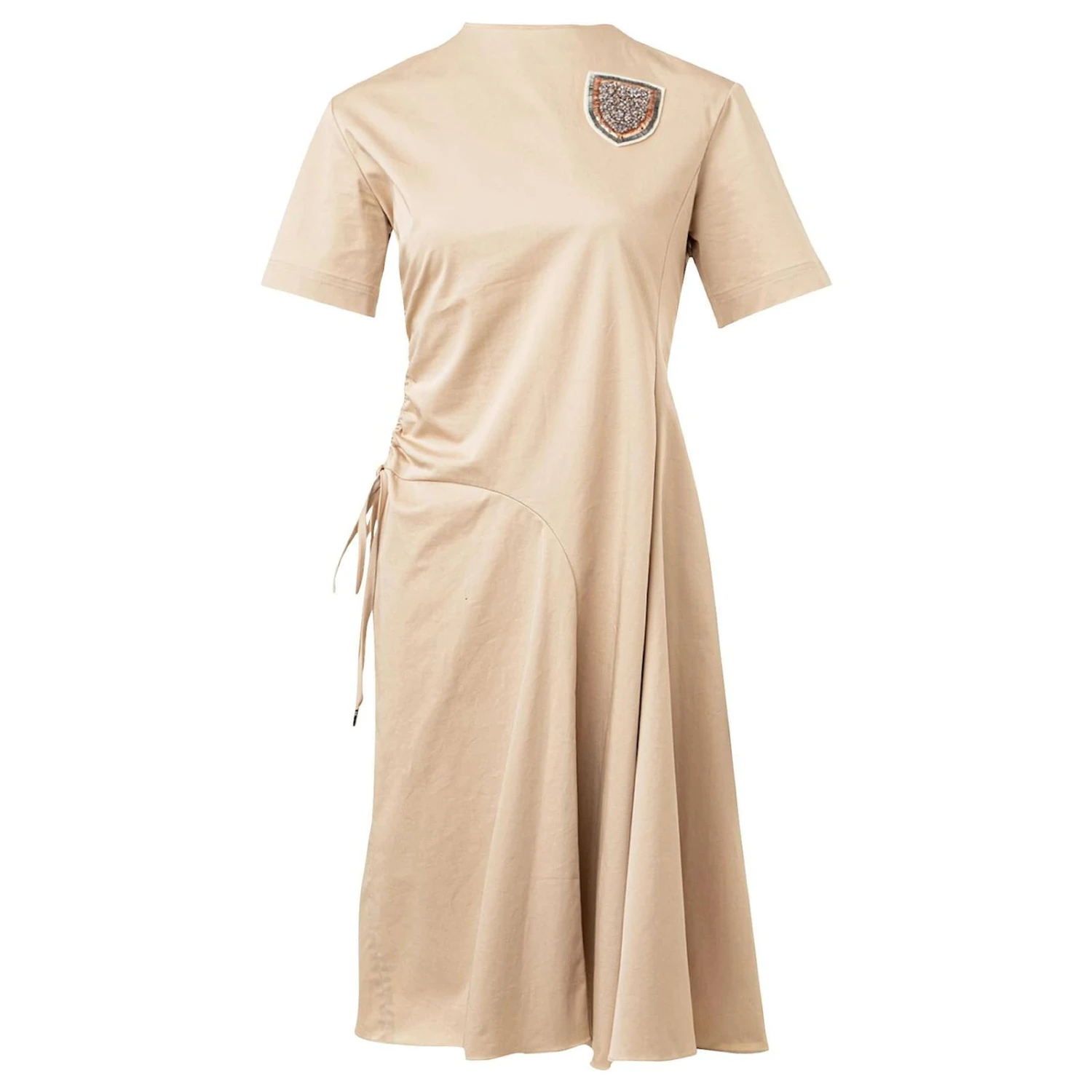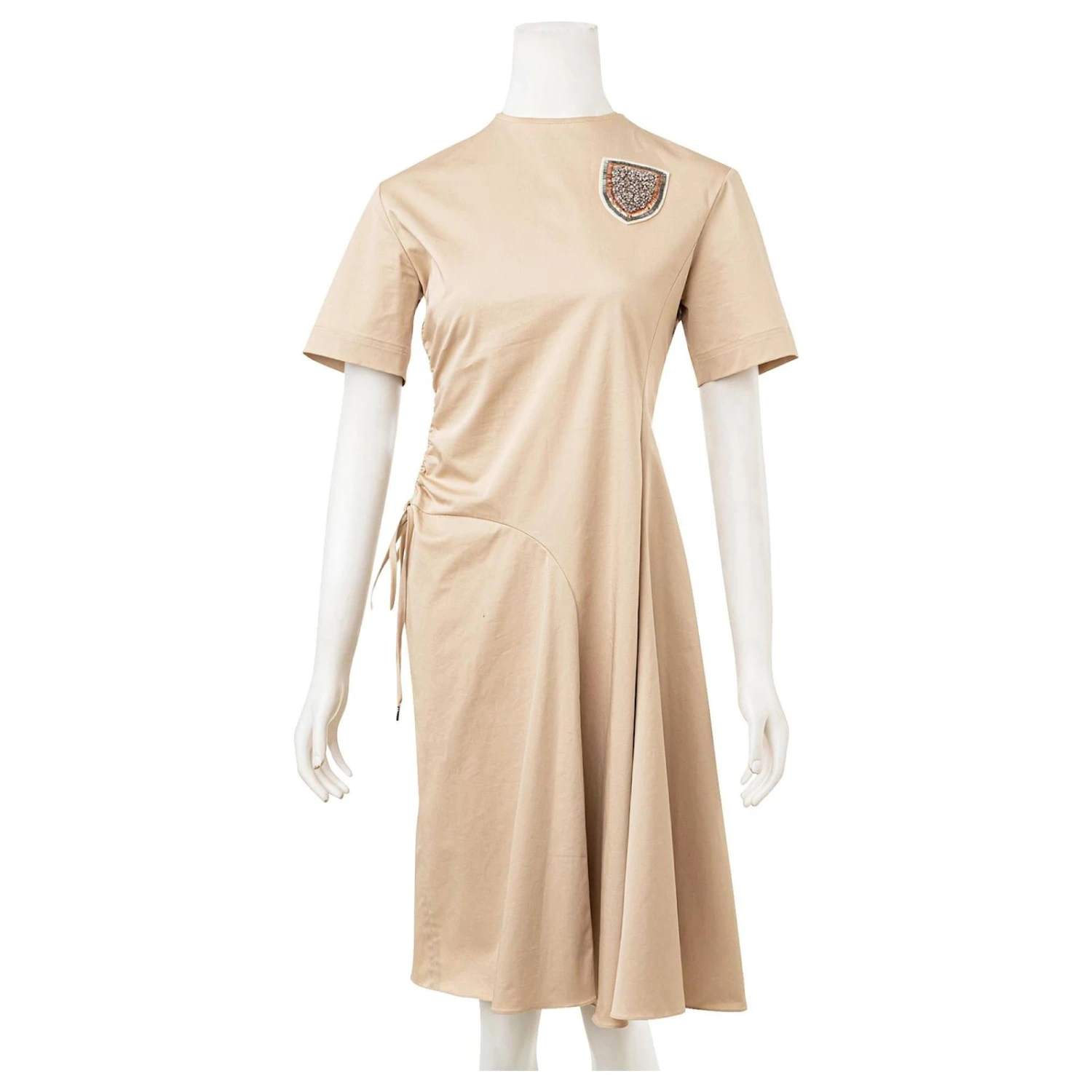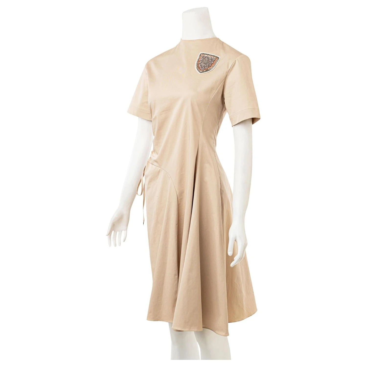 La robe mi-longue rend hommage à l’élégance Dior avec une création empreinte de modernité Elle offre une silhouette évasée sublimée par un effet torsadé asymétrique à la taille.
