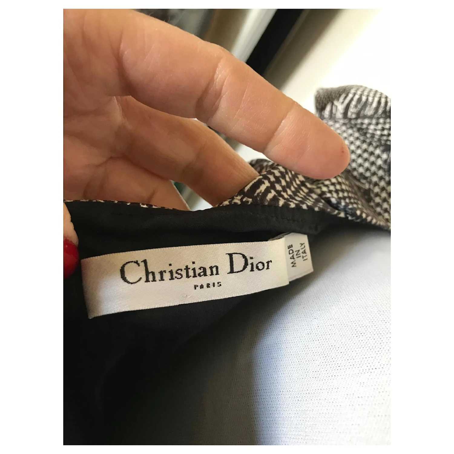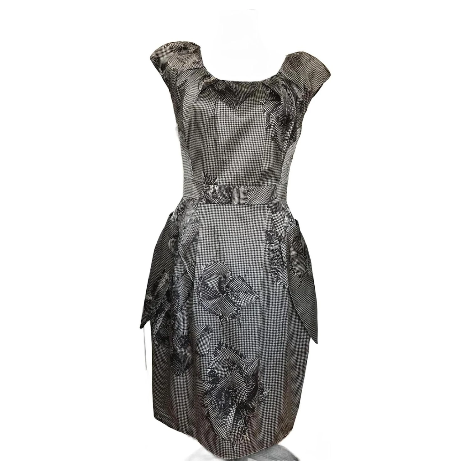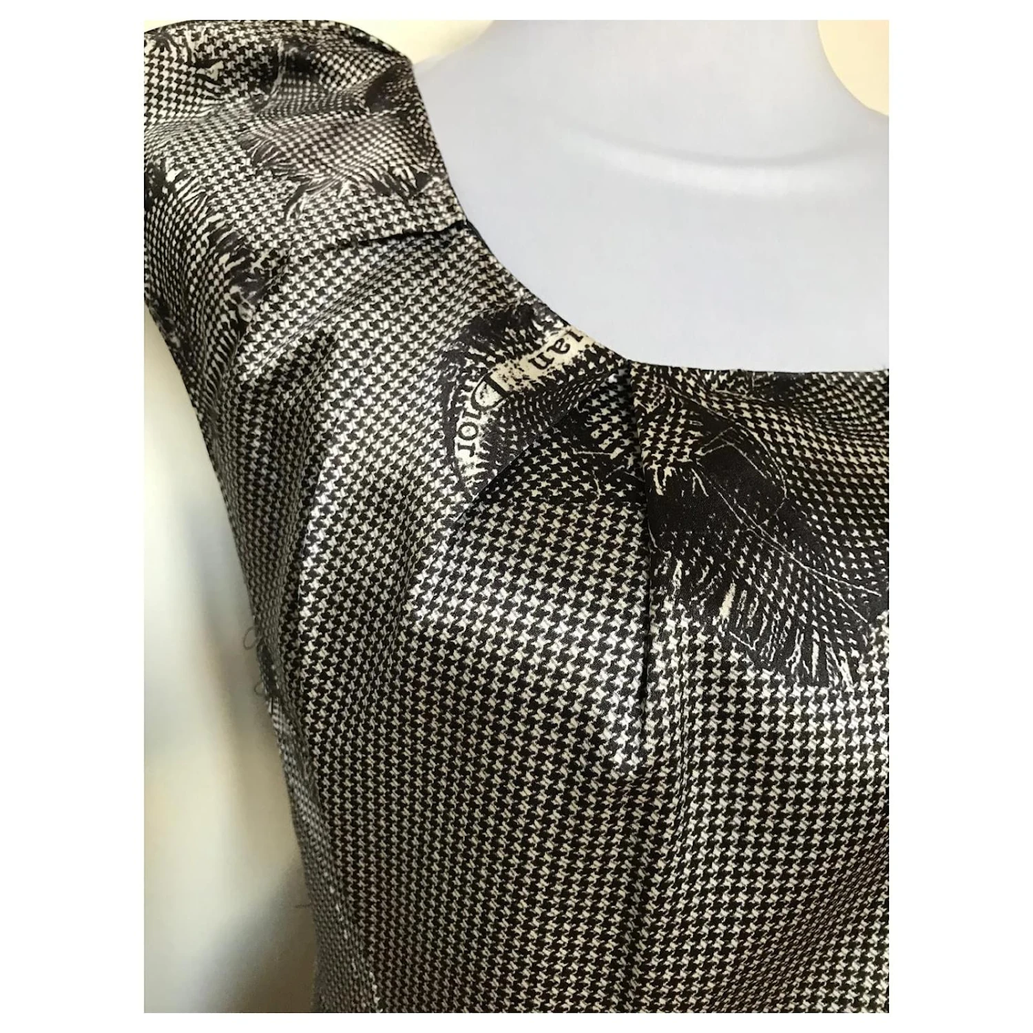 Magnifique robe en soie motifs pied de poule. Monogramme et signature de la robe à plusieurs endroits de la robe. Comme neuve. Taille 38.