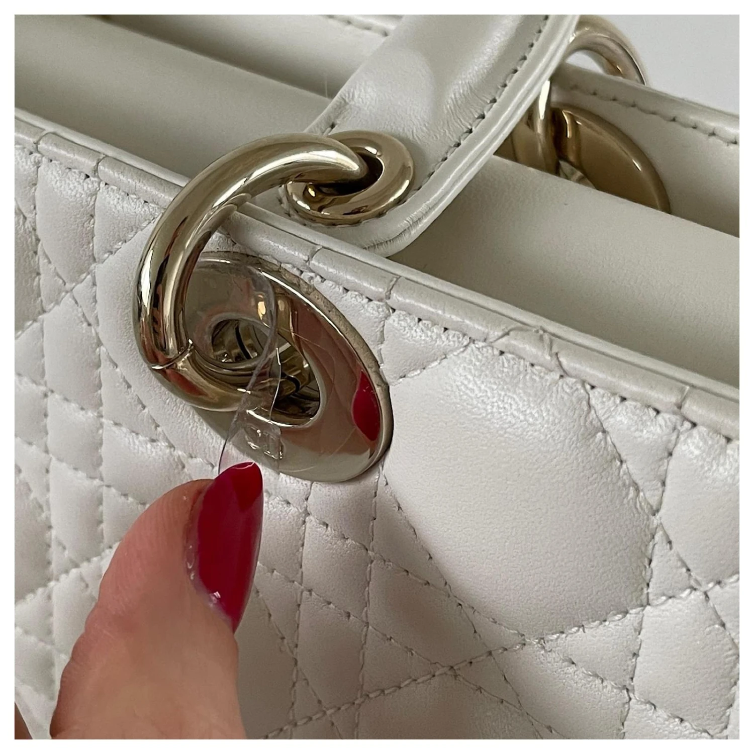 Dior medium lady d-joy en cuir d’agneau, Bijouterie dorée. couleur M030, Latte. Etat très soigné, traces minimes d’utilisation sur les coins, bords, cuir de vachette, rabat intérieur et quincaillerie. Livré avec deux poignées assorties différentes pour porter le sac à la main ou en bandoulière.