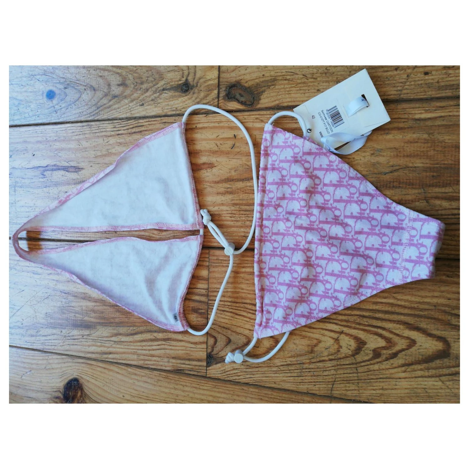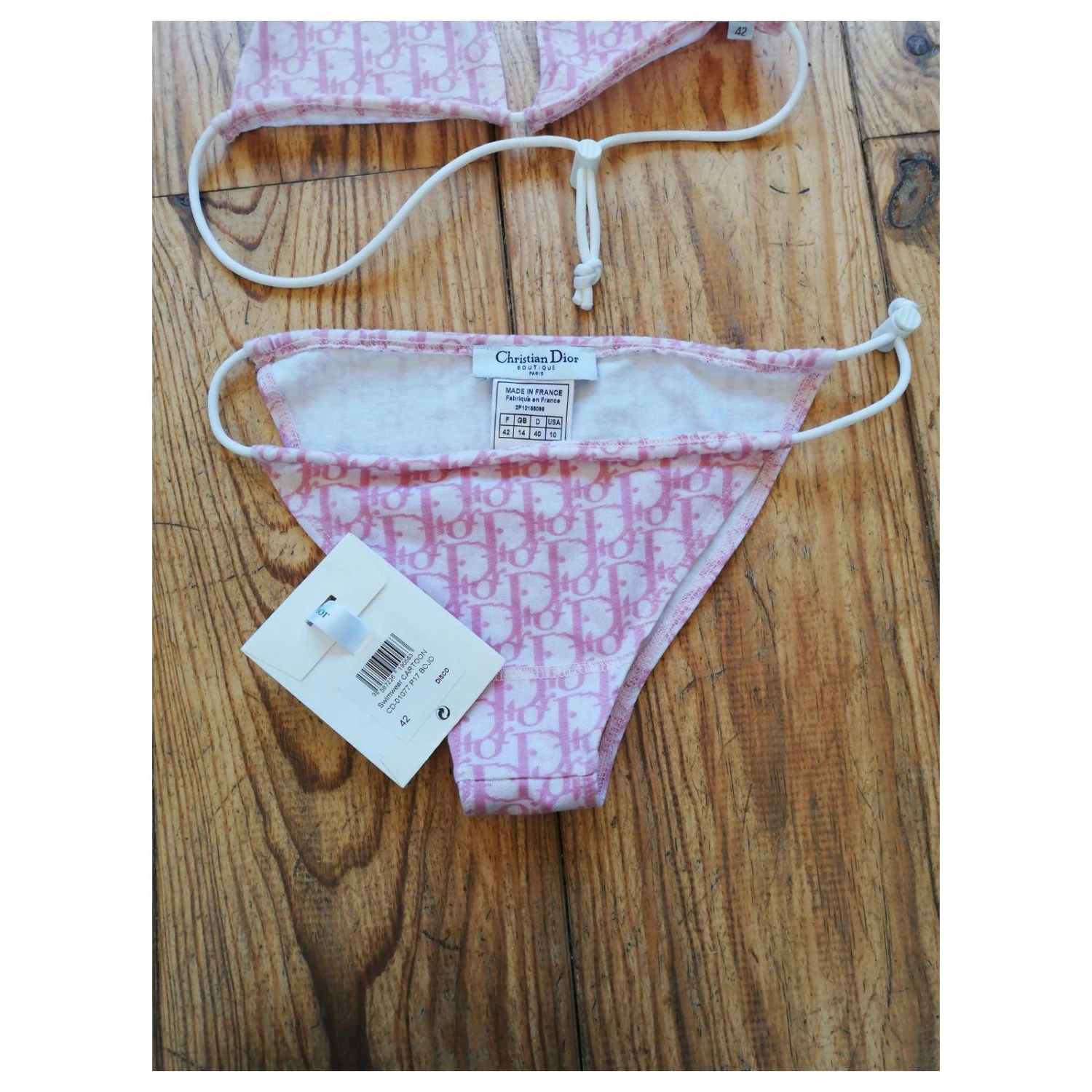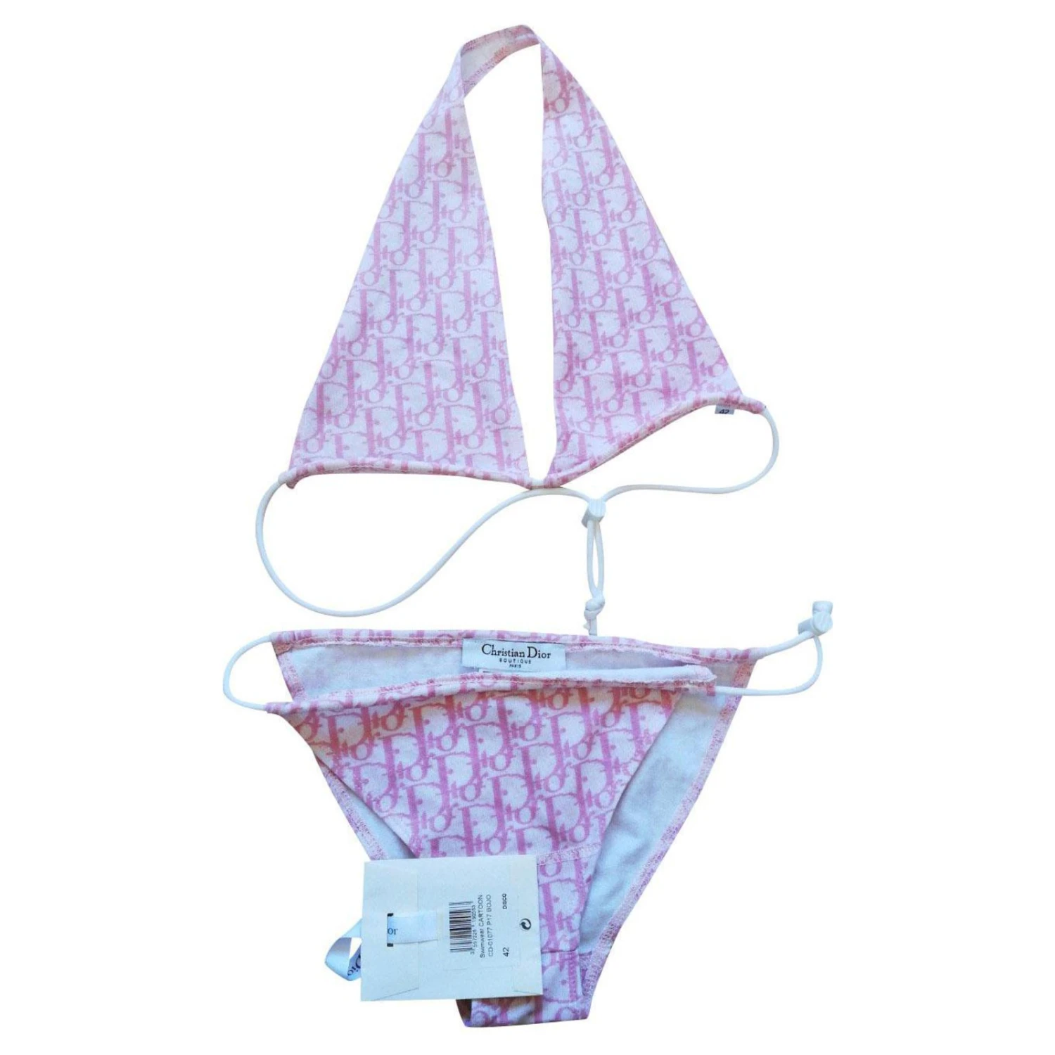Maillot de bain Dior 2 pièces monogrammé rose. Taille indiquée 42 mais correspond à un 36. Jamais porté avec étiquette. Attention petites traces sur le haut à nettoyer, montrées sur la dernière photo.