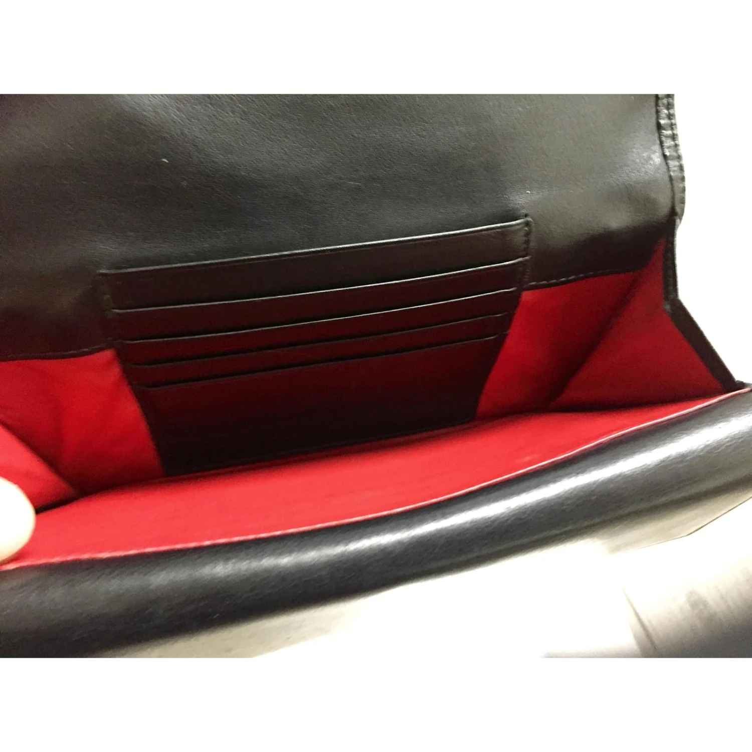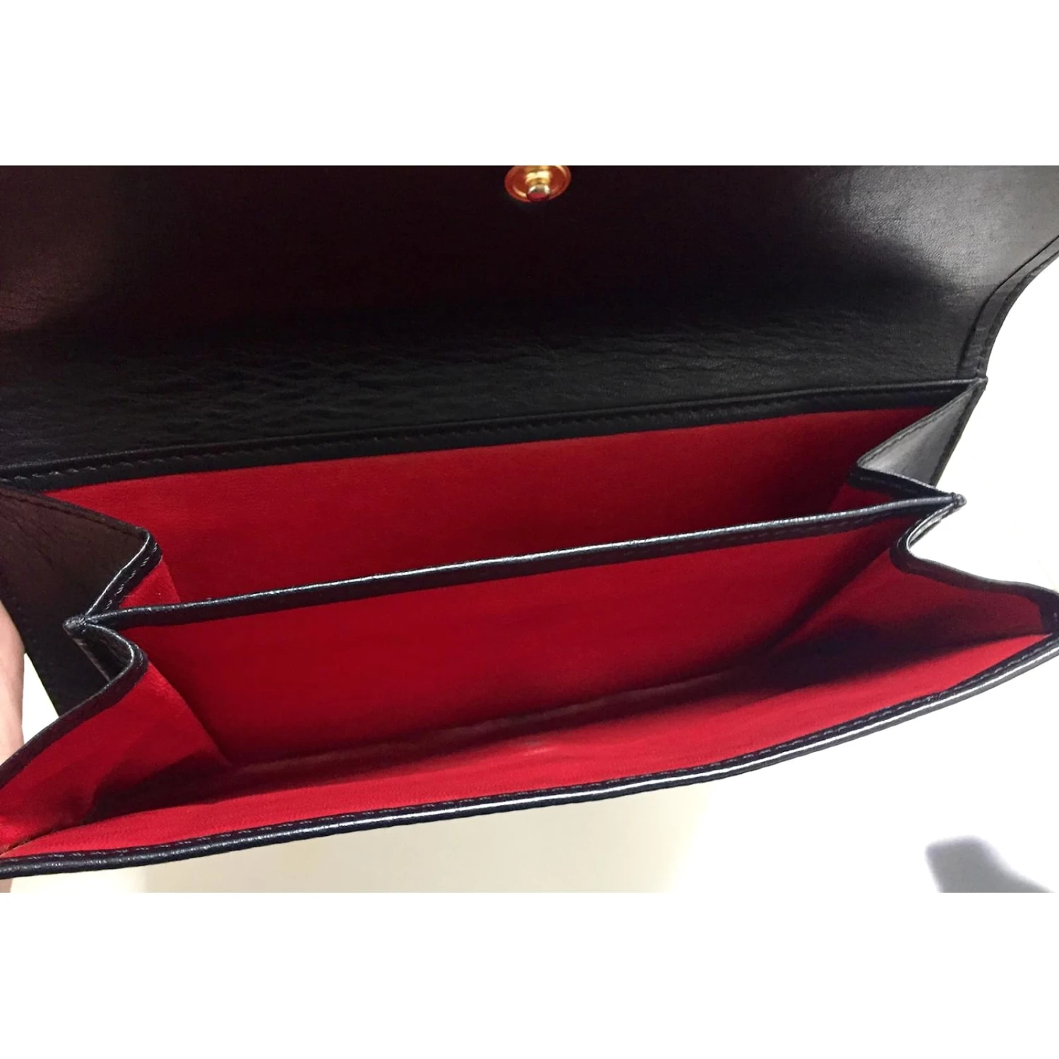 A l’ouverture, il révèle, dans un premier compartiment, un porte-monnaie dont l’intérieur est doublé de cuir rouge et, dans un second compartiment, toujours doublé de cuir rouge, un porte-cartes et range billets.