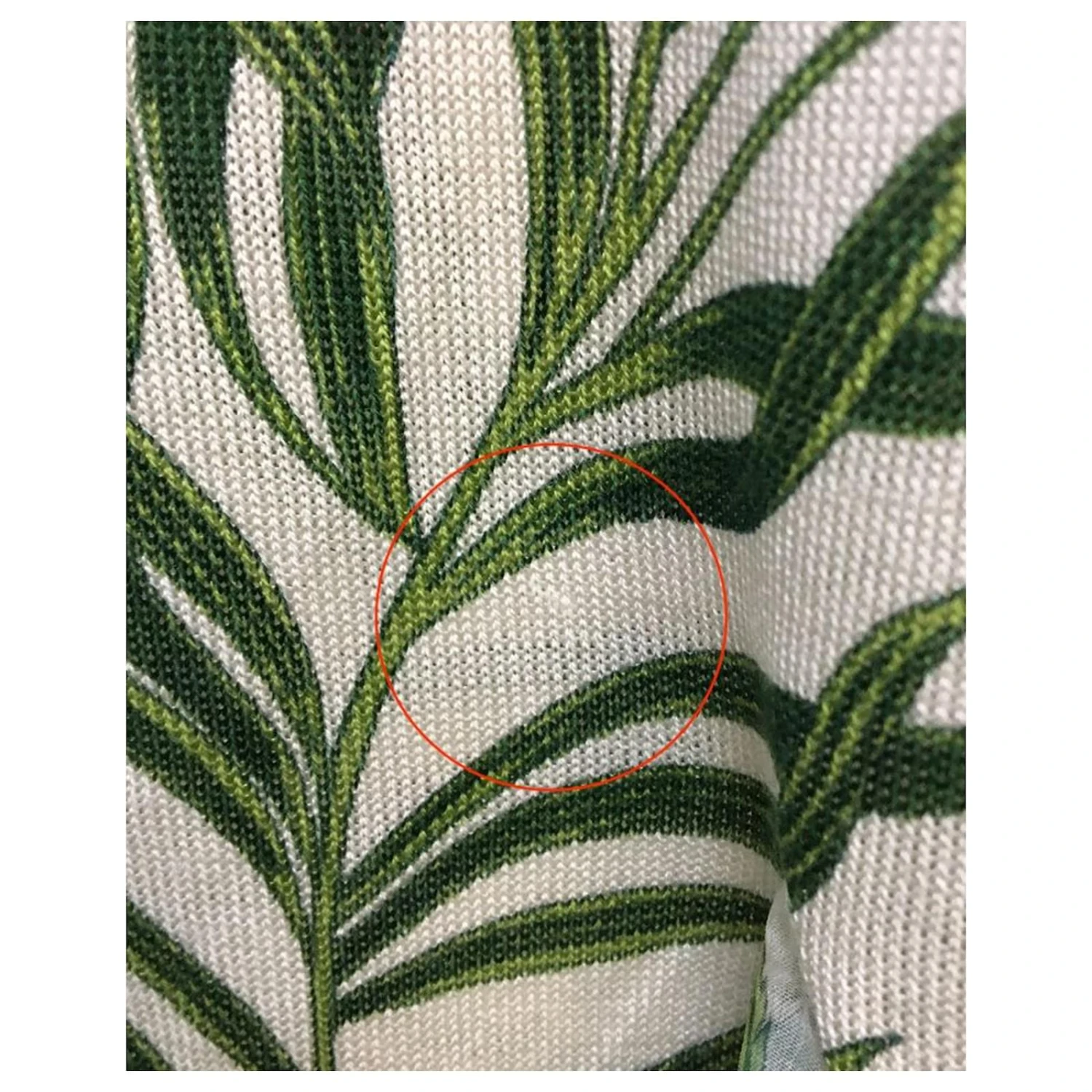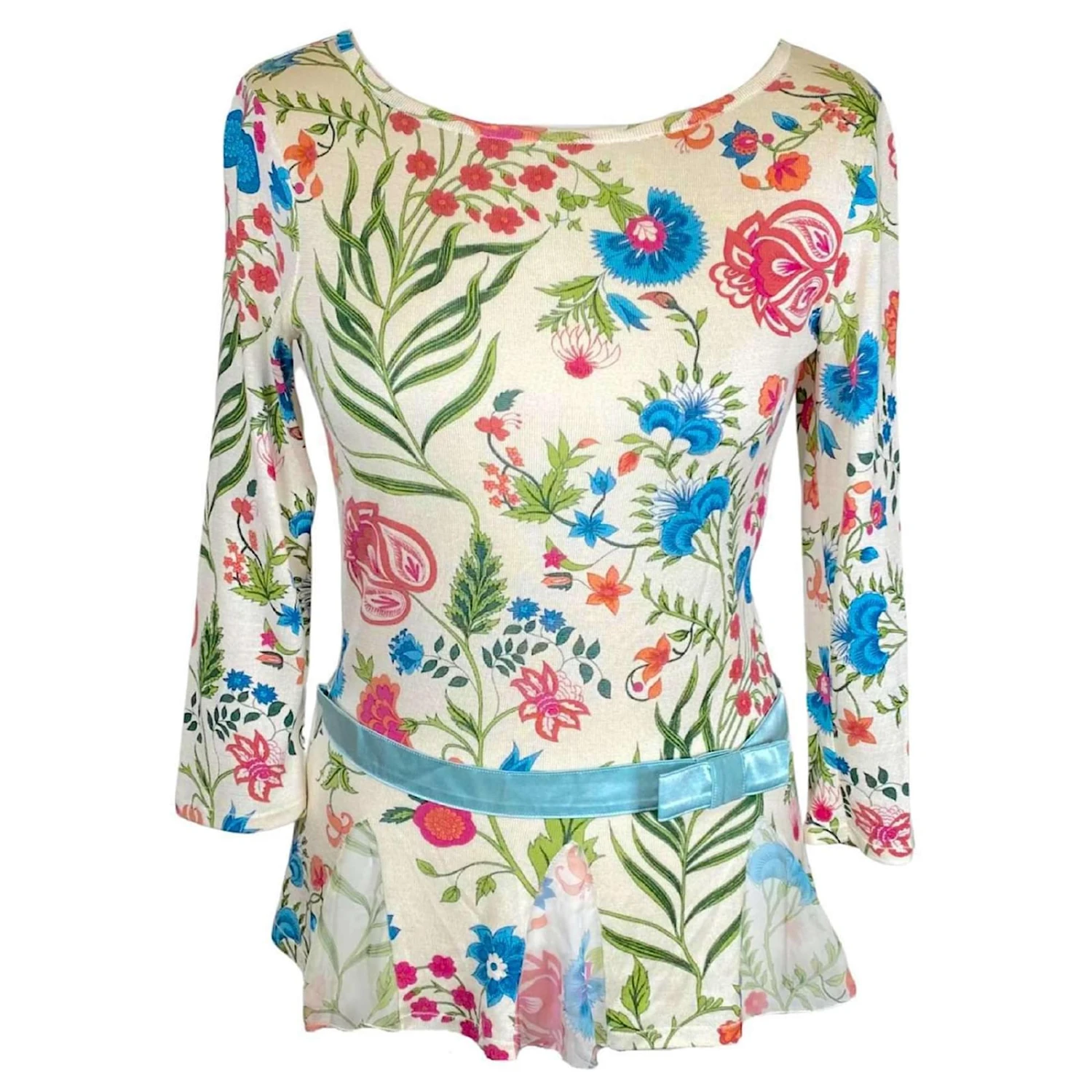 Superbe haut à nœud délicat avec ceinture en soie bleue (amovible). Avec inserts évasés en soie transparente à l’ourlet dans le même imprimé.Longueur épaule à ourlet : 58cm.Excellent état (9.25/10). pas de marques. Deux petites tirettes – une en bas du devant et une en bas de l’ourlet du dos – non visibles.