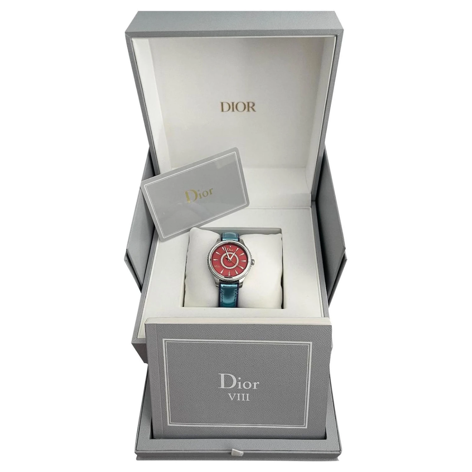 Index diamant appliqué à la main et bague centrale sertie de diamants. Boîtier en acier 32mm, fond plein, étanchéité 50m. Bracelet en cuir bleue ciel métallisé avec garniture violette, fermoir avec boucle ardillon en acier et mouvement type quartz: fonction heure, minute et seconde, sous garantie. La série Dior Montaigne est conçue par les studios d’horlogerie Dior sur l’avenue Montaigne puis fabriquée dans les ateliers Dior de la Chaux-De-Fonds. Montre vendue avec boîte et papiers d’origine , portée 3 fois